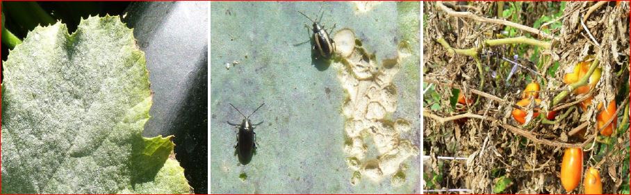 ► A ritka állományú, csak alulról öntözött zöldségfélék is a lisztharmatokkal, atkákkal küzdenek. A cukkini levelét ma fotóztam. A kabakosok lisztharmatára pl. a Cosavet DF, az Eurokén, a Thiovit Jet engedélyezett. A földibolhák hámozgatása is felerősödött, szomjaznak. Káposztalevélen fényképeztem a földibolhákat és a rágásnyomukat. Javaslom a piretroid hatóanyagú rovarölőket (5. felhívás), tapadásfokozó segédanyagokkal kiegészítve. A sűrűn vetett, felülről öntözött zöldségfélékben a nedvességet, dunsztot kedvelő gombák is megjelentek. Levelet kaptam a hagymaperonoszpóra kórképével és ahogy „várható volt” a paradicsomvész is tombol pl. egyes magaságyásokban, mély fekvésű kertrészekben. Lásd a fotót. (Amennyiben csapadékosra fordulna az időjárásunk, akkor a korábbi évekhez hasonlóan országos járvánnyá duzzadhatna, a krumpliban is. Ennél a növénynél burgonyavésznek hívják és a gumókat is megtámadja.) Számos felszívódó és kontakt, pl. réztartalmú gombaölő kapható (a szőlőnél felsoroltak mindkét „vészre” engedélyezettek, 7 napos é.v.i.-vel.)