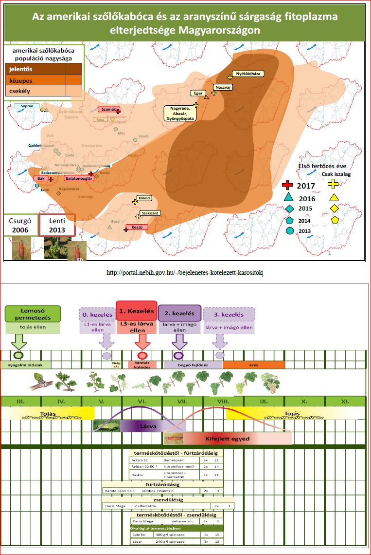 ► Sajnos az amerikai szőlőkabóca által terjesztett a szőlő aranyszínű sárgaságát okozó fitoplazma is tovább terjedt 2017-ben. Manapság talán ez okozza a legnagyobb fejtörést a növényvédősöknek. Néhányan második filoxérajárványnak titulálják! Ez talán túlzás hiszen már egy viszonylag jól kidolgozott technológiával védekezhetünk a terjesztő kabóca ellen. Lentebb beillesztettem a NÉBIH ajánlását (www.nebih.gov.hu). Az biztos, hogy nagyon alapos és szigorú hatósági ellenőrzésekkel követik az útját, ültetvényekben és házikertekben is. A NÉBIH-ben kaptam azt a térképet is, melyen a fertőzött tőkék helyszíneit tüntették fel.