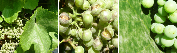 ► A fertőzöttség tekintetében óriási különbség lehet még egy kerten, egy kordonon belül is. A fényképek egymástól kb. 5 méterre készültek. Az elsőn egészséges levelek között megbúvó már beteg bogyókat láthatnak. A másodikon közelről is megtekinthetik a sérves szőlőszemeket. Ezekből már nem lesz bor az idén. A harmadik felvételen lisztharmatos levelek között érlelődő egészséges fürtöket találtam. Mikor és hányszor kellet volna permetezni? Csak a kertjét jól ismerő, azt rendszeresen bejáró gazda tudhatja a választ.