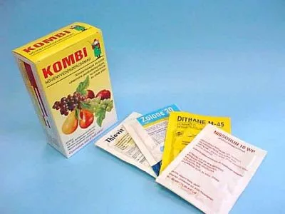 Combined preparation against diseases and pests of apples and grapes. In grapes against peronospora, powdery mildew, grape moths, spider mites. In apple crops against scab, powdery mildew, apple moths, spider mites. May be used in accordance with a techn...