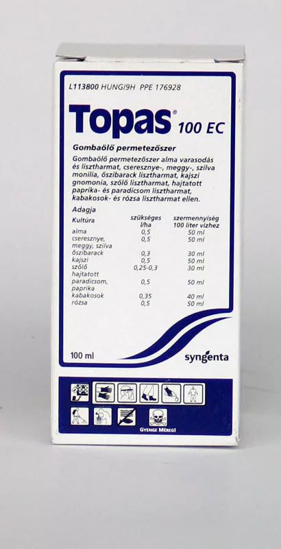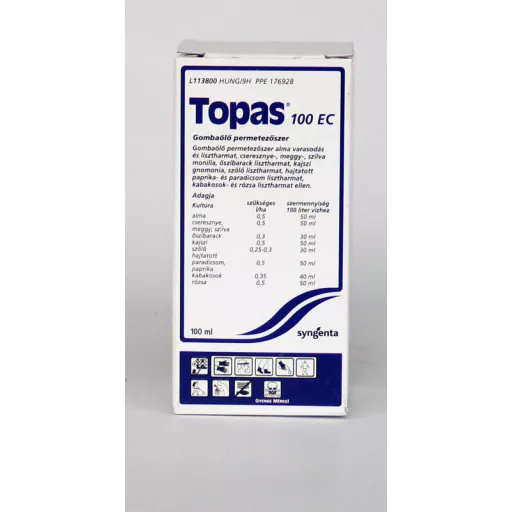 Házikerti felhasználás: 5 ml10 l víz. A Topass 100 EC tulajdonságai: Munkaegészségügyi várakozási idő: 0 nap Hatóanyagtartalom:  100 g/lpenkonazol Hatóanyag család: triazolok Formuláció: EC (emulzióképző permetezőszer) Környezeti besorolás: Vízi szervezet...