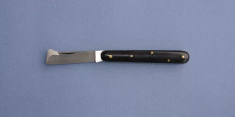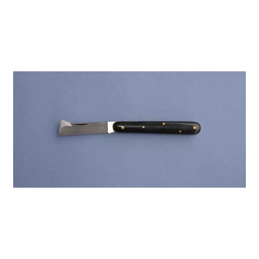 Small sized extinguisher knife with plastic handle. Length: 9.5 cm Weight: 45 g Blade: folding, carbon steel Blade thickness: 2 mm Handle: oval, plastic Sheath: copper