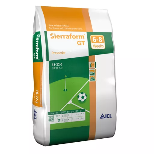 SierraformGT Pre-Seeder 18-22-05 (6 - 8 weeks effective life) micro-granules contain slow release nitrogen and potassium in addition to the traditional NPK formulation. Ideal for over-seeding or new turf planting. High phosphorus content promotes rapid and vigorous root formation.