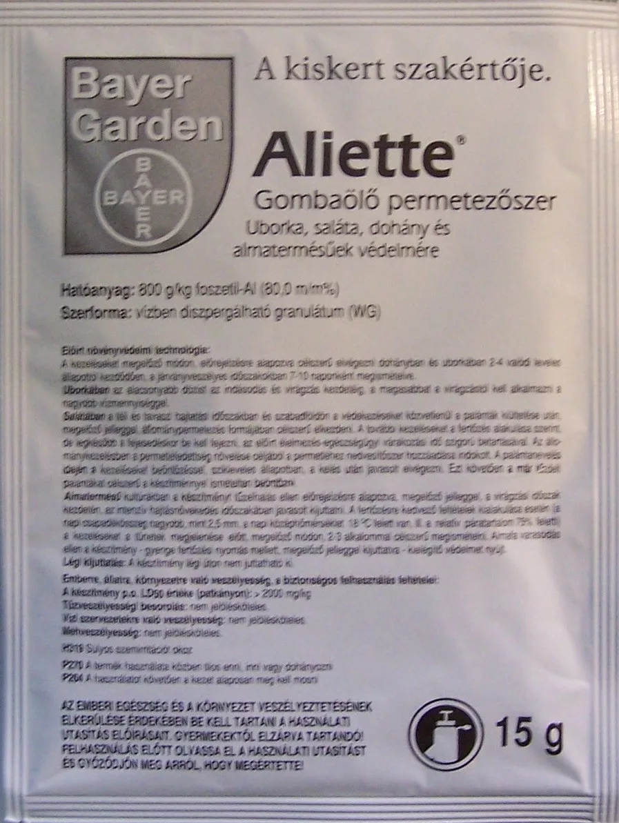 A long-acting fungicide with a unique mode of action, with an absorbable effect. The active ingredient phoszetil is unique because it acts throughout the plant, strengthening its natural defence mechanism. The fungicidal spray can be used in cucumbers, lettuce and tobacco against peronospora, in apple orchards to prevent needle-killed bacterial diseases and against scab.