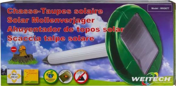 Mole repellent device using batteries. It emits little or no audible ultrasound at a frequency that is very strong enough to disturb the mole's nervous system. The mole cannot adapt to this constantly changing, disturbing environment. The environment bec...