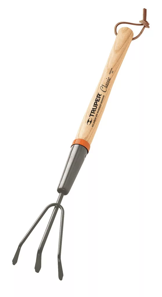Small earth loosener with 3 teeth, 51 cm long, 38 cm roundwood handle.
