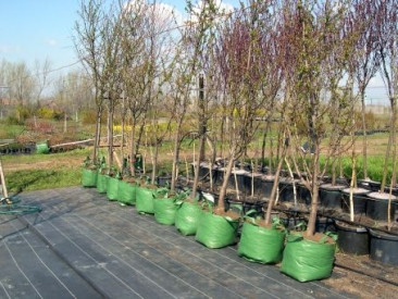 Made of laminated HDPE polyethylene fabric, with two tabs, UV stable, with 16 holes in the base, aesthetic green colour. Diameter 30 cm Height 30 cm