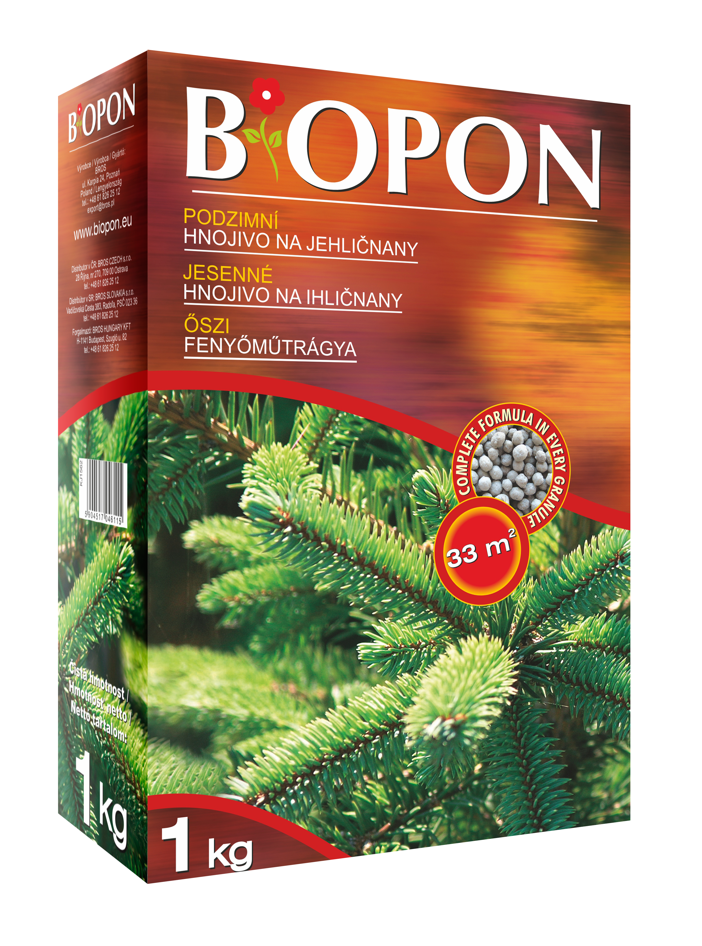 Multi-component, nitrogen-free fertilizer for autumn nutrient supplementation of conifers. Ensures proper colouring of conifers and promotes lignite formation, which provides increased protection against cold.