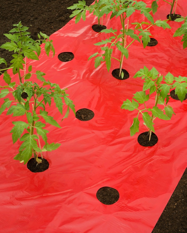 Holand tomato film in red colour. Made of polyethylene (LDPE), microperforated mulch film. Resistant to UV radiation. The film regulates soil temperature and retains moisture. It is well suited for low crops. It protects the crop from contamination and prevents fungal infestation in the soil. The red colour reflection has been proven to double and redden the crop, keep the fruit clean and permeate water. Its design end protects plants and soil from erosion. It eliminates weeds. Weeds take nutrients away from the crop. Three rows of 20 8 cm holes punched 30 cm apart, 4.75 m2 area.