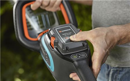 The Powerful GARDENA Battery Hedge Trimmer PowerCut Li-40/60 is perfect for convenient, cordless trimming of large hedges. The ErgoLine handle ensures a comfortable grip and easy use in any cutting position. The optimised blade geometry ensures an efficient, fast and clean cut. The intuitive control panel on the handle ensures the most comfortable working experience. The set includes a battery and a charger. The Hedge Trimmer is powered by the easy-to-maintain GARDENA System Battery 40 V* and 2.6 Ah. The battery can be quickly recharged at any time without memory effect. * The battery has a maximum unloaded voltage of 40 V and a nominal voltage of 36 V.