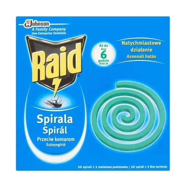 In summer, one of the essentials for late-night conversations with friends is a mosquito repellent spiral. Mosquitoes, those voracious little bloodsuckers, can spoil a pleasant summer evening's tractables by targeting all humans and animals to satisfy their hunger. Make your surroundings a mosquito-free zone with the Mosquito Repellent Spiral, which uses patented ingredients to keep mosquitoes at bay like a protective barrier. Using the mosquito repellent is simple: place the coil in its holder and light the end. Important: Raid Mosquito Repellent is for outdoor use only! The Raid mosquito repellent spiral package contains 10 spirals and 1 holding plate.