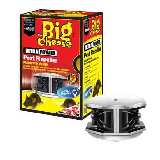 The Big Cheese ultra power ultrasonic rodent repeller. The device is capable of emitting extra powerful ultrasound. With the Ultra Power, you can keep invasive rodents out of your environment chemical-free and maintenance-free. The unit can be used in g...