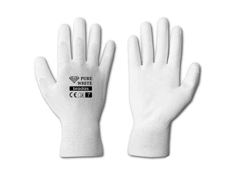 Bradas Pure White polyurethane coated gloves, made of polyester material with high cut and tear resistance. Perfect for precision manual work.
