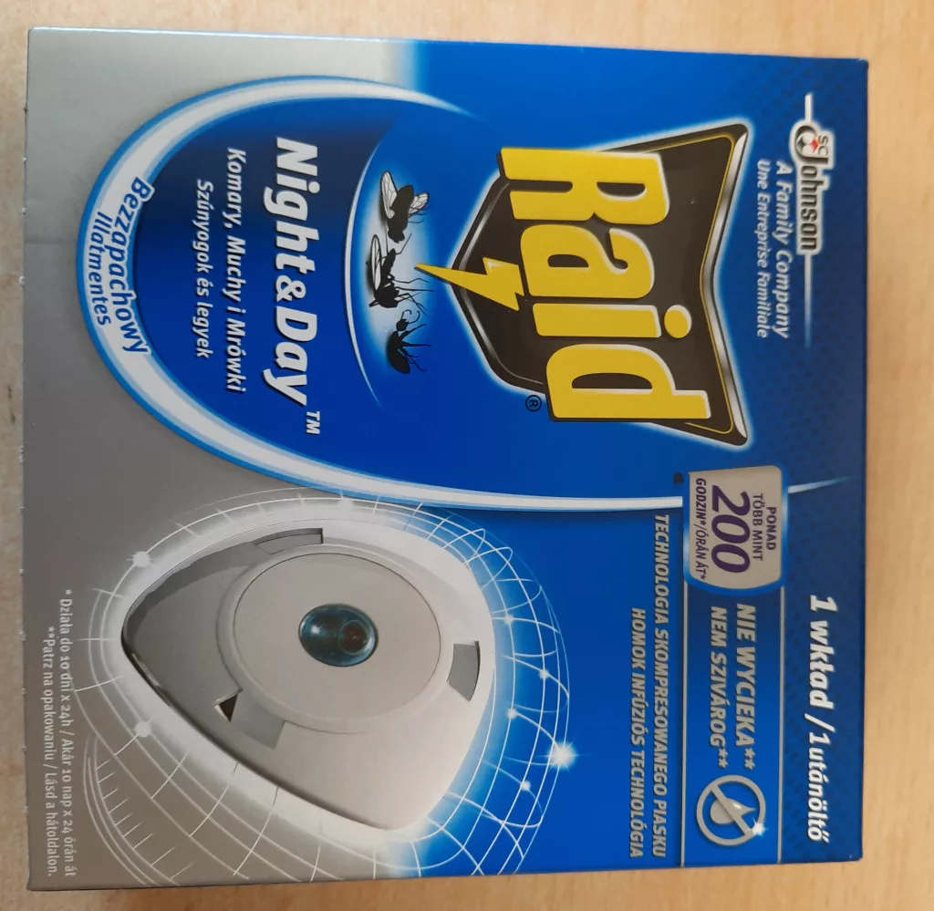 The Raid mosquito and fly control disc provides effective protection against mosquitoes and flies 24 hours a day for 10 days. The new technology electric appliance refill contains pressed sand infused with fragrance-free fly and mosquito repellent, providing protection against mosquitoes and flies for 10 days.