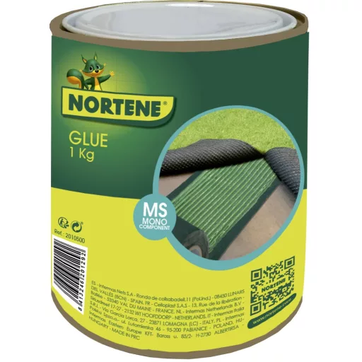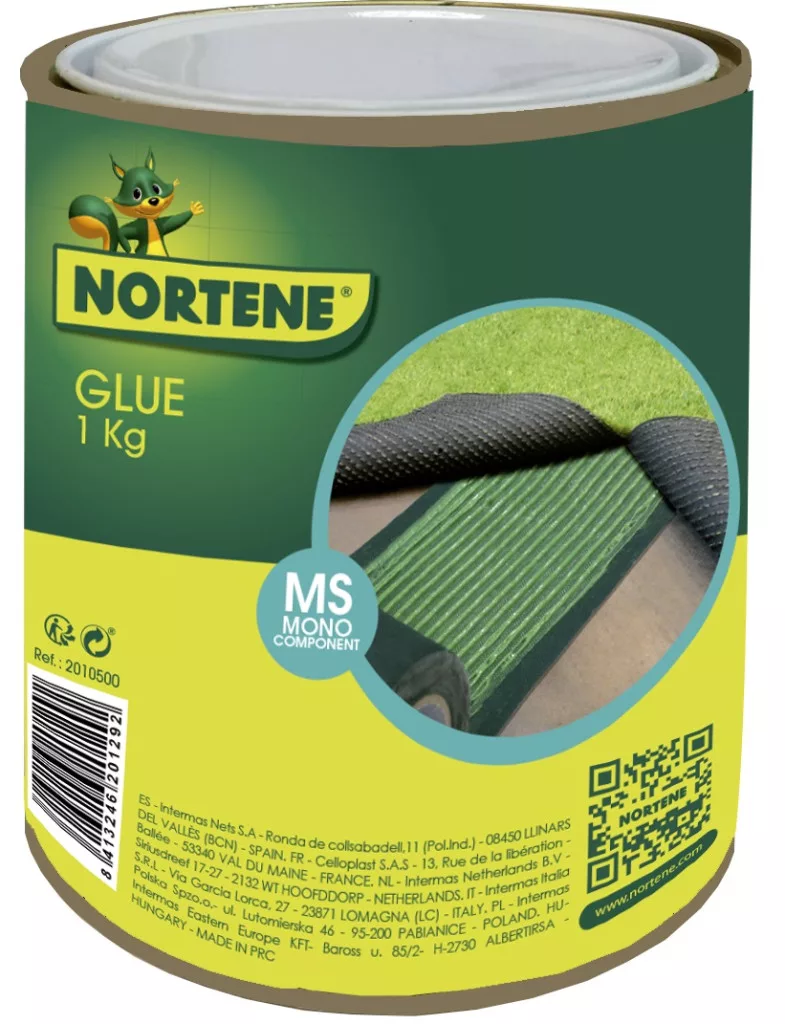 Waterproof polymer. Dosage: 100-200 g/m2, depending on the porosity of the surface. 1 kg is sufficient to glue 15 m of masking tape. Cleaning: remove excess adhesive stains immediately with acetone. If it hardens, remove mechanically. Ideal installation between +5˚C-50˚C. After 24 hours after installation, the grass can be trodden on.