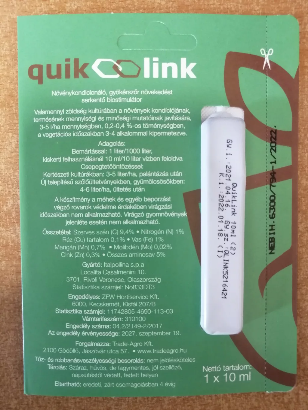 QUIKLINK is a special organic nutrient rich in amino acids and peptides, with added trace elements (copper, iron, molybdenum, manganese and zinc). The biologically active components (trace elements, amino acids and peptides) are essential for root growth.root growth and the strengthening and thickening of root tissues (lignification). Molybdenum is essential for the development of vegetative parts of the plant. It increases metabolism, thus helping to combat environmental stresses and pathogens. It works extremely well with mycorrhizal fungi. Can be used as drip irrigation and as a foliar fertiliser.