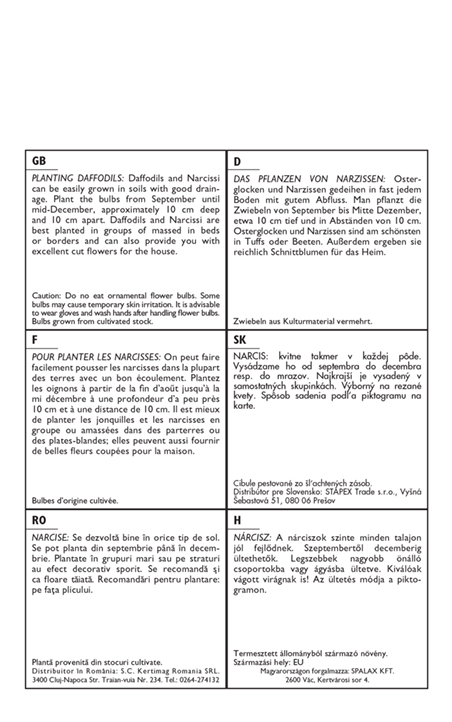 Narcissi grow well in almost all soils. They can be planted from September to December. They are best in large groups or in beds. They also make excellent cut flowers. See pictograms on the packaging for planting instructions.