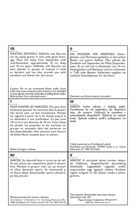 Narcissi grow well in almost all soils. They can be planted from September to December. They are best in large groups or in beds. They also make excellent cut flowers. See pictograms on the packaging for planting instructions.