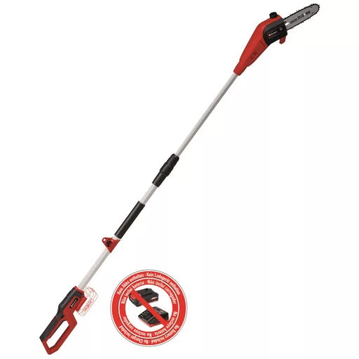 The Einhell GC-LC 18/20 Li T-Solo cordless pruning saw is an indispensable tool for regular maintenance of trees and taller shrubs. The pruner is part of the Power X-Change family. The device is available without battery and charger, which you can buy separately, for example in the form of practical starter packs with different capacities. The 200 mm blade length (top-quality OREGON saw chain and cutting blade) and 5.5 m/sec cutting speed ensure that you can cut branches quickly and efficiently without any problems. The motor head can be tilted 30°. Using the extension handle, you can cut even higher branches with ease. The rubberized surfaces ensure comfortable work and a strong grip. The tool also comes with a strap supplied from the factory. The metal drive guarantees a long service life. The claw stop is made of metal, and the chain locking pin ensures maximum safety. The saw lubricates the chain continuously during use.