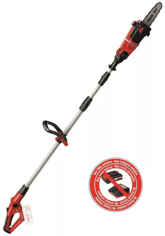 The GE-LC 18 Li T cordless pruner is a powerful tool that can easily cut high branches while standing on the ground, independent of the mains. The metal material drive ensures a long service life, the OREGON quality cutter and the OREGON chain give a clean cutting result. The telescopic handle, which can be infinitely adjusted between 880 mm and 1840 mm, can be precisely adjusted to the desired working height. The auxiliary grip, also infinitely adjustable, can be adjusted to suit all users with a practical quick-release handle. The 90° rotatable ratchet ensures easy, horizontal cutting. For clean and precise cutting at height, the motor head can be tilted in 7 positions and the gripper in 4 positions, so it can be adjusted to any working position. The claw stop prevents the saw from slipping. The automatic chain lubricator supplies the OREGON chain with the necessary lubricant via an oil reservoir. If necessary, the chain can be adjusted and replaced without tools using the practical chain tensioner. The chain catching pin reliably prevents the chain from slipping off the cutting plate. The battery and charger are not included.
