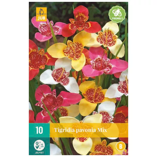 The Tigridia pavonia hybrid (tiger flower or Mexican clam flower) has 15 cm triangular flowers. It has a triangular shape with three triangles of 3 to 5 cm and is very colourful. The leaves resemble sword flowers or irises. The plant has several flowers per branch, each flower blooming for only a few days. Height 45 cm.
