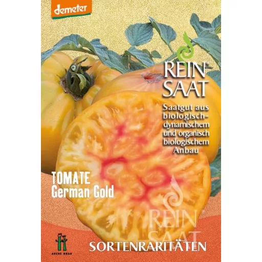 German Gold tomato seed is a large, grooved, spherical tomato with a thin skin. The fruit is very fleshy, juicy and tasty, and the juice is very sweet and delicate. The colour is golden yellow with a red centre and 'flame'.