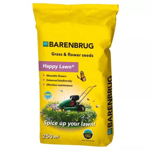 With Happy Lawn® technology you can have a positive impact on your immediate environment. A solution that combines a hardy lawn with mowable flowers. These are flowers that can be mowed over and over again with the grass, but with each mowing, the flowers are protected from damage and can be cut with aThey grow back renewed after each mowing, making your lawn easy to manage, lush and colourful.