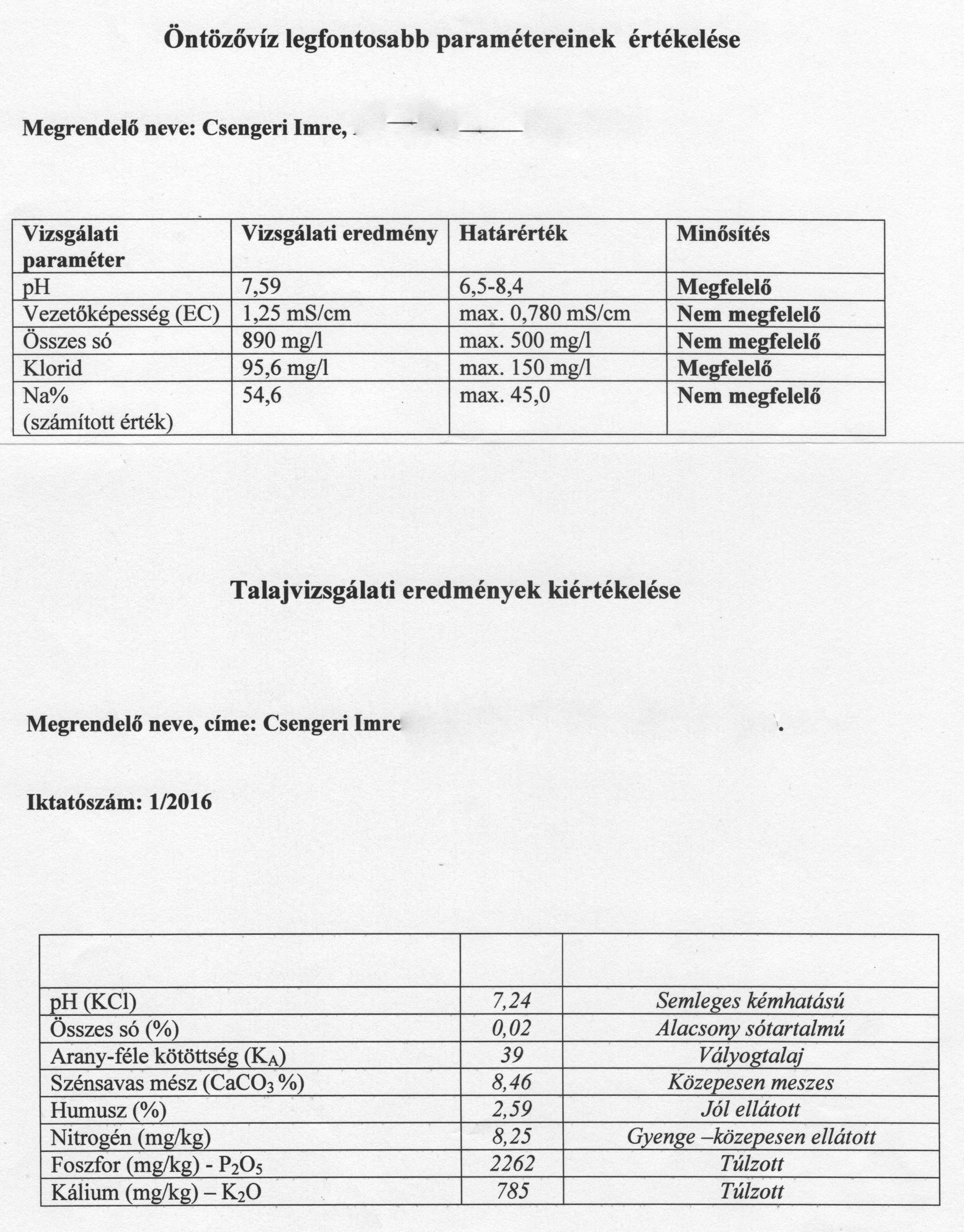 Köszönöm a válaszát ,ezután megcsináltam a talaj és öntöző víz vizsgálatot,több probléma is látszik, az eredményt mellékletben küldöm ezek javitására szeretném a tanácsát kérni,fáradozását ezuttal is köszönöm.