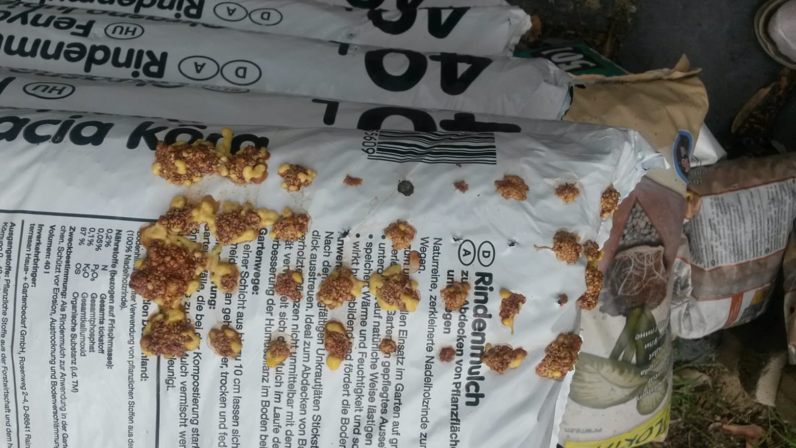 Sárga folyós állaga van, és elég gyorsan odanőtt. Pár órája még nem volt ott semmi. Megnéztem a maradék, bontatlan fenyő mulcsos zsákokat és azon is volt...kora tavasszal lett letéve.