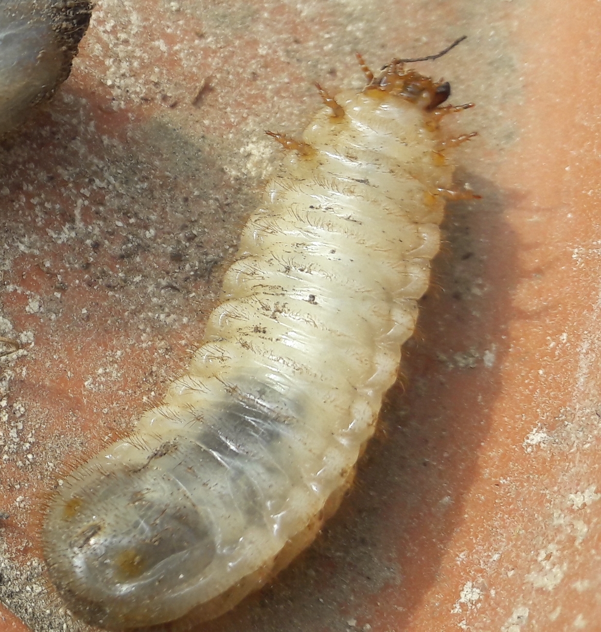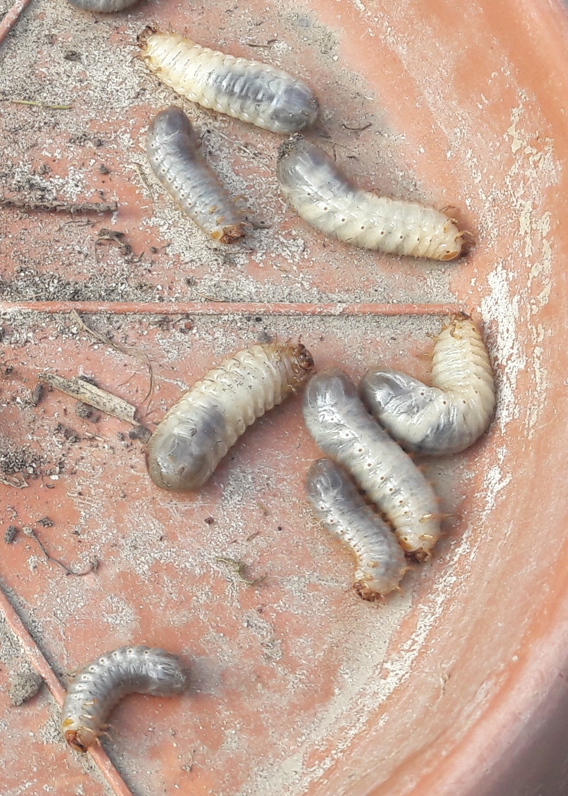 Kicsi a lábuk és a rágószervük is, a hátukon másznak, szerintem rózsabogár lárvák. A szürkék ugyanezek csak még fiatalok szerintem. Egyre több van a komposztban és egyre nagyobbak, 4 cm körüliek.