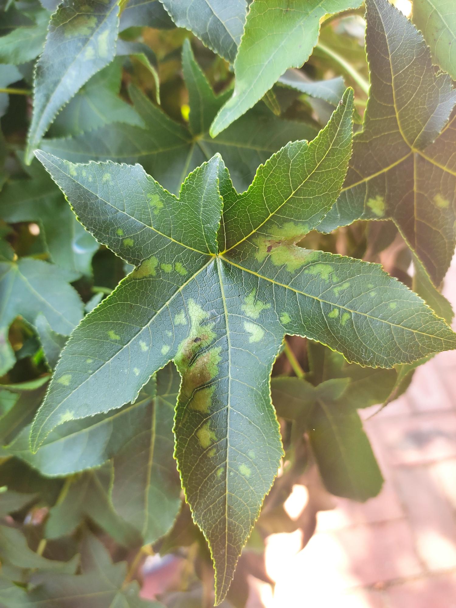 Az ámbrafa leveleinek foltosodásának több oka is lehet. Most leginkább a légszárazságra vagy napégésre lehet gyanakodni. Erről ír ez a cikkünk: https://www.gazdabolt.hu/cikkek-hirek/cikk/2025.-evi-16.-novenyvedelmi-felhivas
