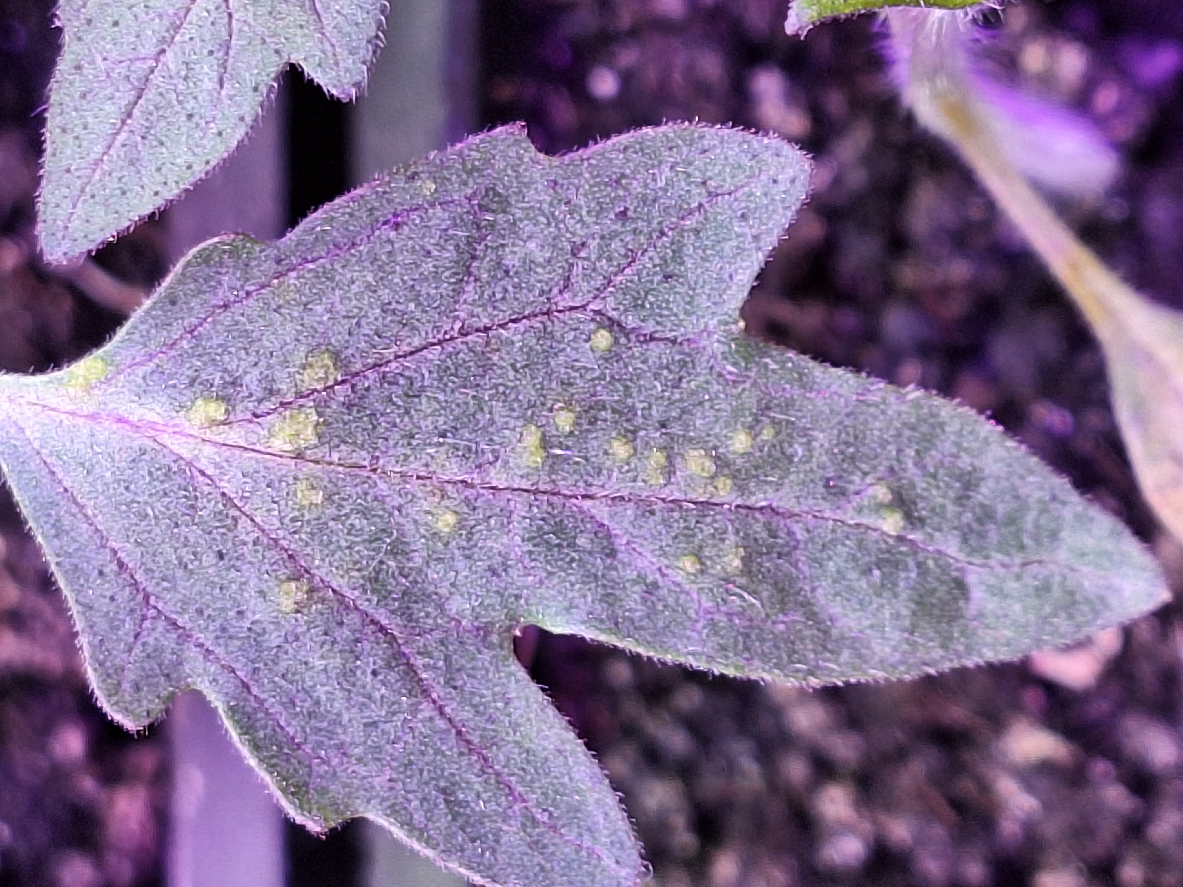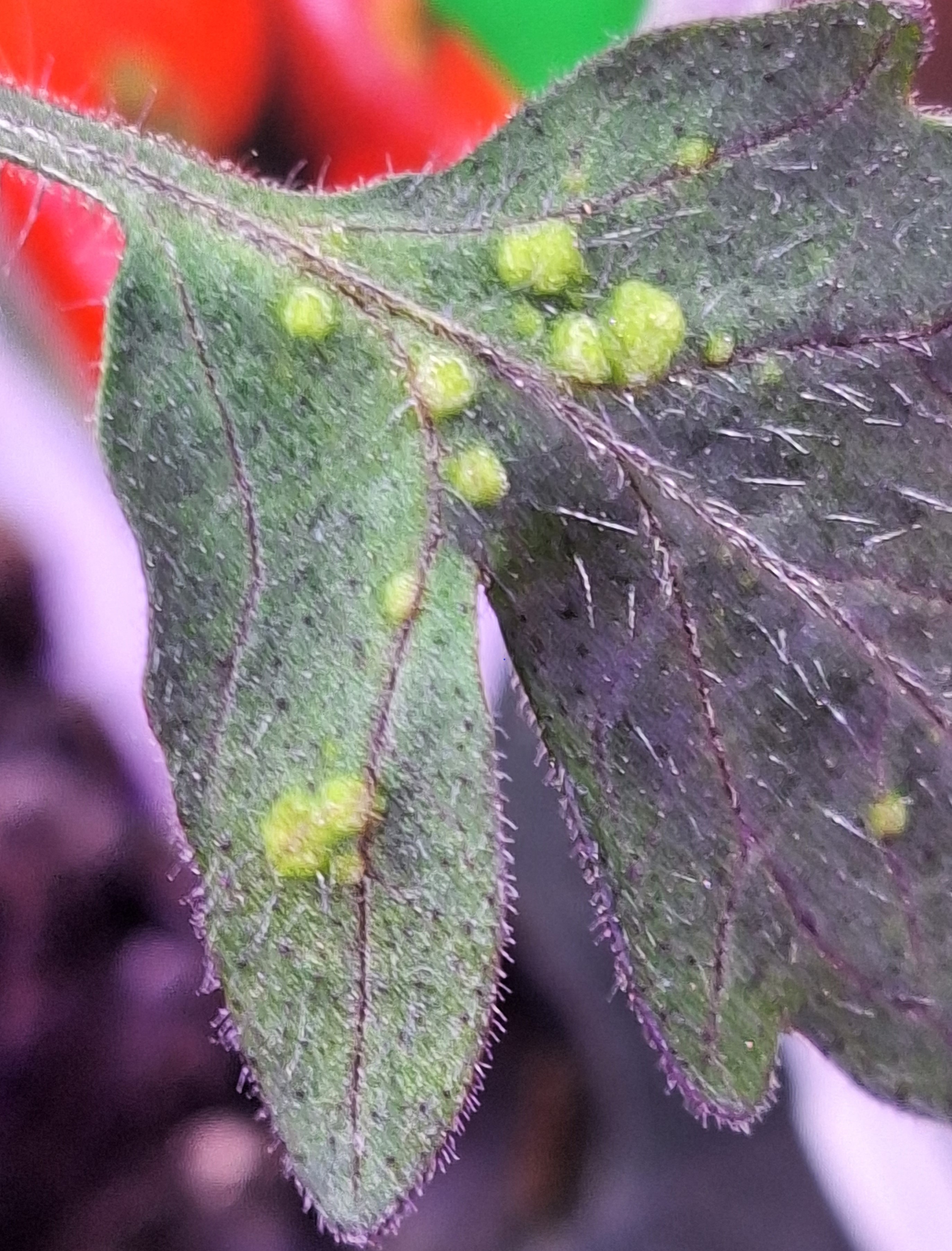 A paradicsomot gubacsatkák támadták meg, elképzelhető, hogy a talajban, vagy a termesztőedényen voltak peték, és a lakásban keltek ki. Érdemes lenne atka elleni szerrel kezelni a növényeket. Jó választás a Flumite mely szelektíven csak a kártevő atkákat gyéríti.