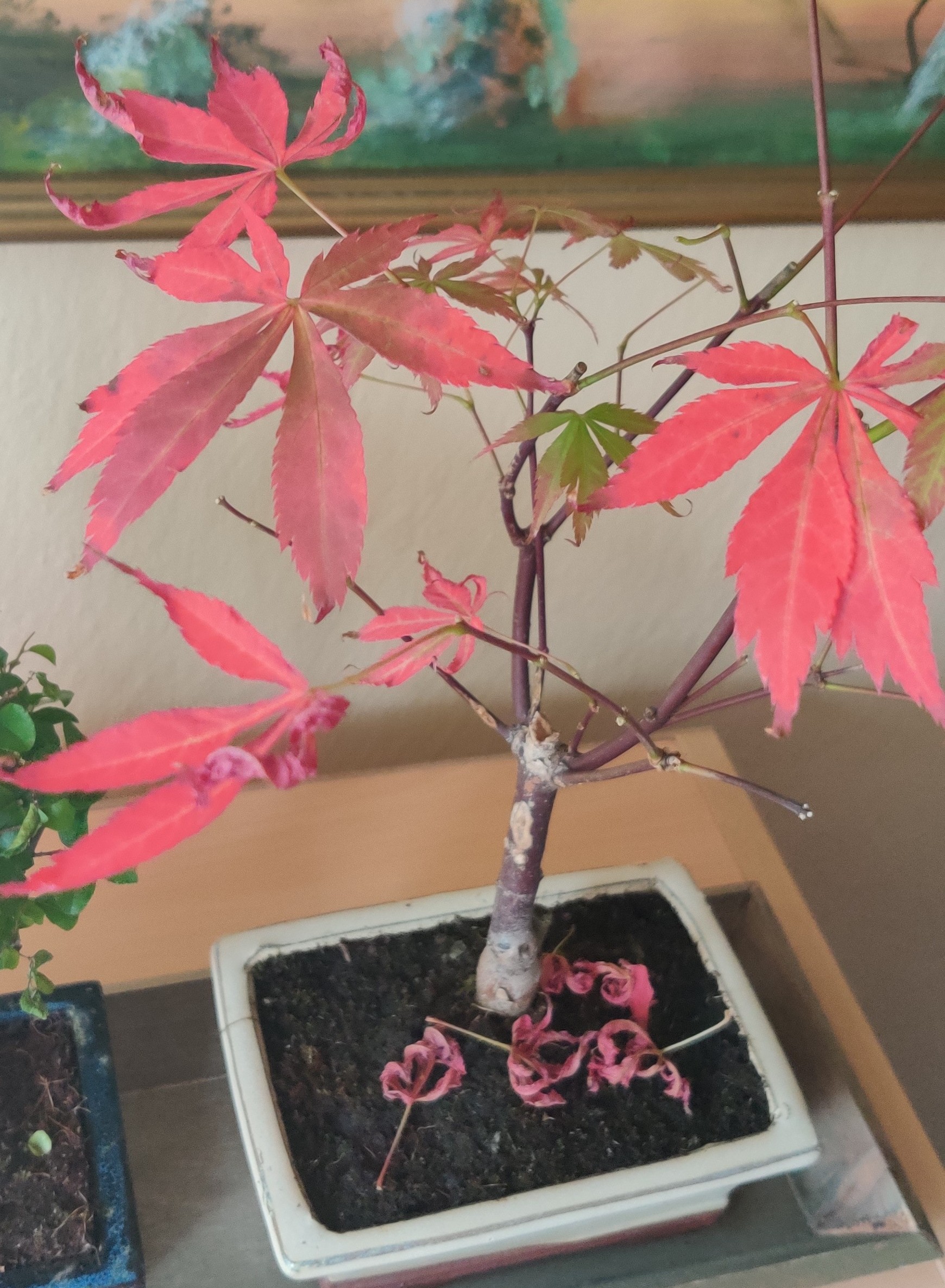 A nemrég kapott juhar bonsaifácskám levelei sorra leszáradnak. Ahogy a viragboltban tanácsolták, minden nap beleraktam egy tál vizbe és hagytam 5 percig hogy megszivja magát majd esővizzel a leveleit is megpermeteztem. Attól félve hogy túlőntőztem, a hétvégén nem locsoltam de továbbra is csak hullanak a levelei.