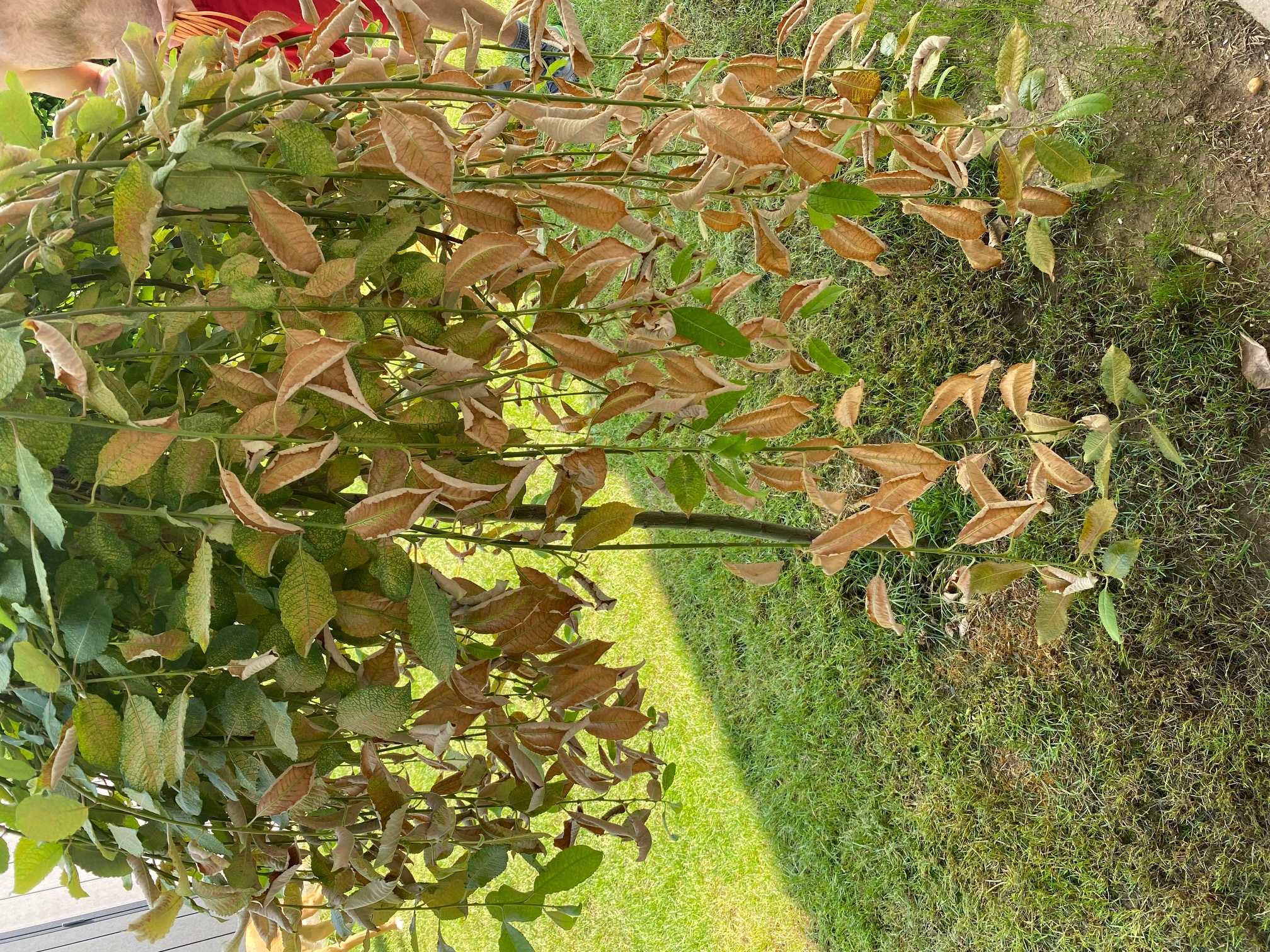 A forróság az ok. Ha jól látom, a kép jobb szélén burkolat kezdődik, onnan verődhet vissza a hő, azért sárgul az a fele. A növény törzséhez képest túl nagy a lombtömeg: ritkítsa meg a növényt, és vágja vissza a kárt szenvedett részeket is. Párásító öntözés is javasolt. Célszerű a burkolatot is nedvesíteni!