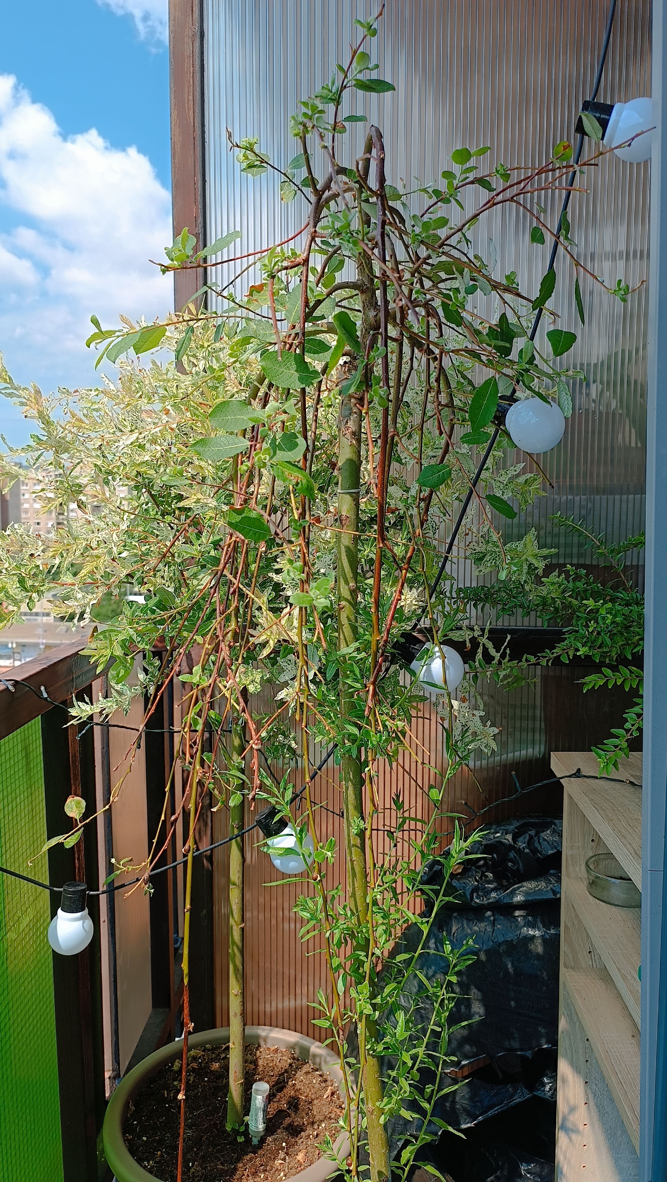 A törzsén növő hajtások az alanyhajtások, amiket el kell távolítani, mert sok vizet és tápaanyagot elvon a növénytől. A fűz alapvetően vízparti növény, párás klímát igényel a rendszeres üntözés mellett. Száraz, forró napos teraszon , ahol a fal visszaveri a hőt és a fényt, a levelei, hajtásai megéghetnek, sárgulhatnak.
