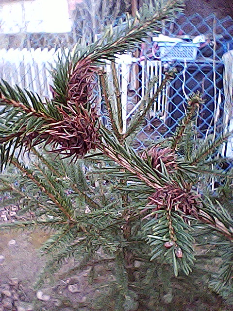 A lucfenyő gubacstetű támadta meg a növényt. Ez a tavalyi gubacs, ami az "ősanya" által készített gubacsban fejlődő lávák szívogatása következtében alakult ki. A gubacsos ágakat el kell távolítani és elégetni. Olajos lemosó permettel (pl. Vektafid A) lehet most védekezni (napközben 8-10 C-fok hőmérséklet fölött) az áttelelő ősanya ellen. Vizsgálja át a növényt, hogy nincsenek-e friss zöld gubacsok. Ezeket is el kell távolítani. Március-áprilisban 10-14 naponként 2-3 alkalommal felszívódó készítménnyel (pl. Mospilan) védekezhet a kikelő lárvák ellen.