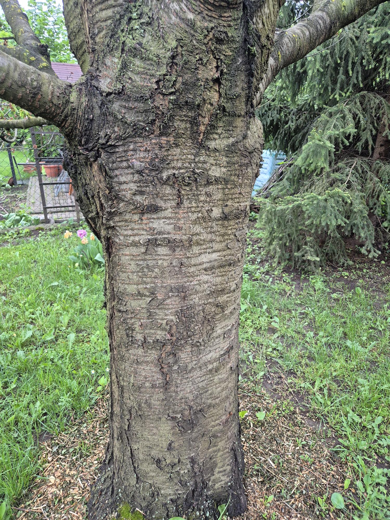 Kedves Tibor! Köszönöm a képeket. A cseresznyefa törzse egészségesnek tűnik, mégis a föld feletti részen kisebb beszűkülés látható.Jó lenne kis kapával elhúzni a földet a törzs földben lévő részénél és megnézni, mi található ott. Lehet ott gomba-fertőzés - pl. az Armillaria, amelynek a termőteste szeptember-októberben jelennek meg a törzsnél és láthatóvá válnak a világosbarna,5-6 cm átmérőjű kalapos gombák. Ez a fakorhasztó betegség nem gyógyítható. Mégis - hiszen addig ez csak feltételezés. Ajánlom, hogy a fát vissza kell vágni a hajtásvégeken 20-25 cm mélységben. A metszés elősegítheti az újraindulást. A fa öregnek látszik. Ha idősen nem is, fiatal korában sokat öntözhették, de a talajvíz is magas lehet. Ez építkezésnél vagy nagy eső idején a pince mélységében megállapítható.