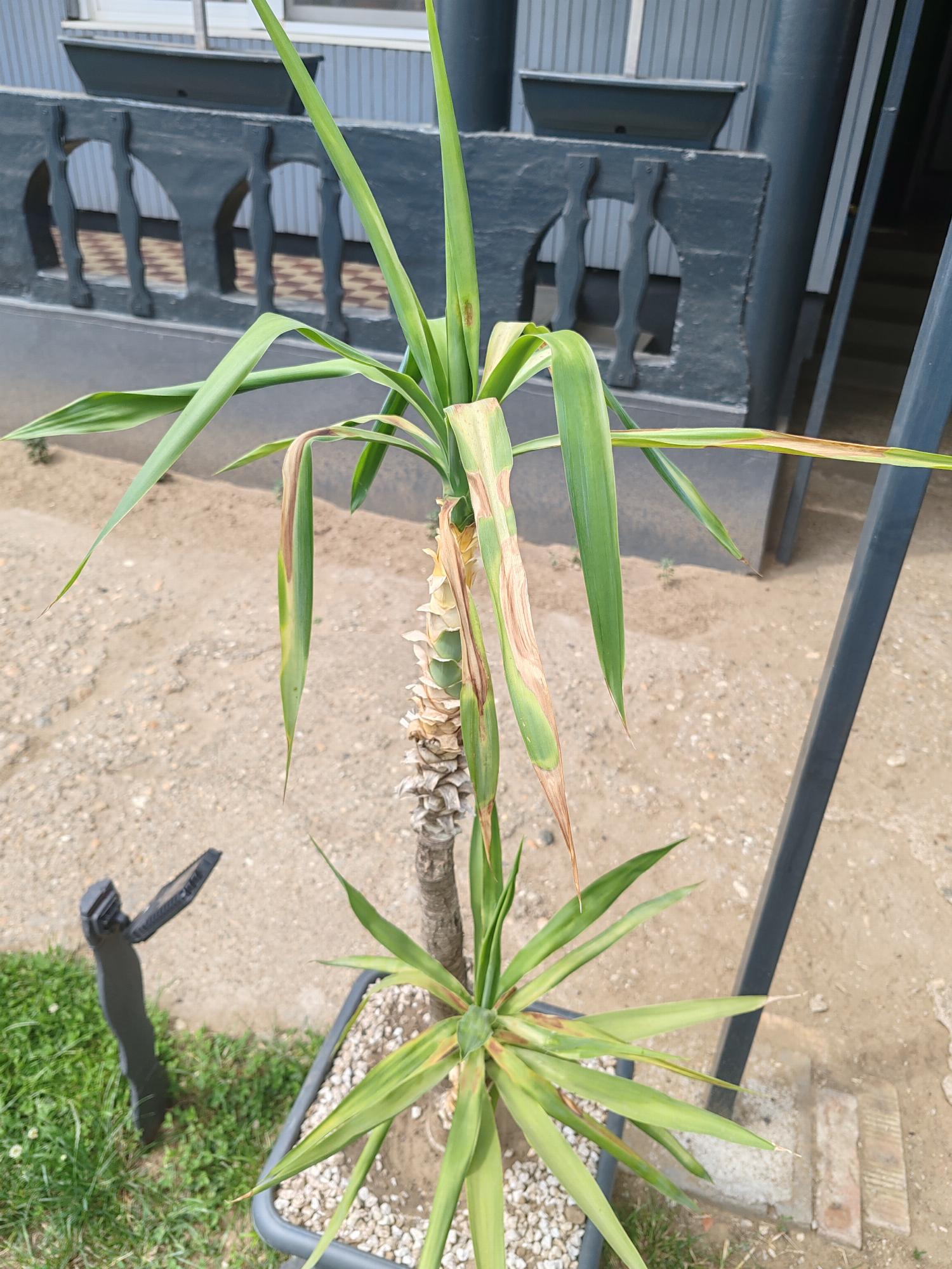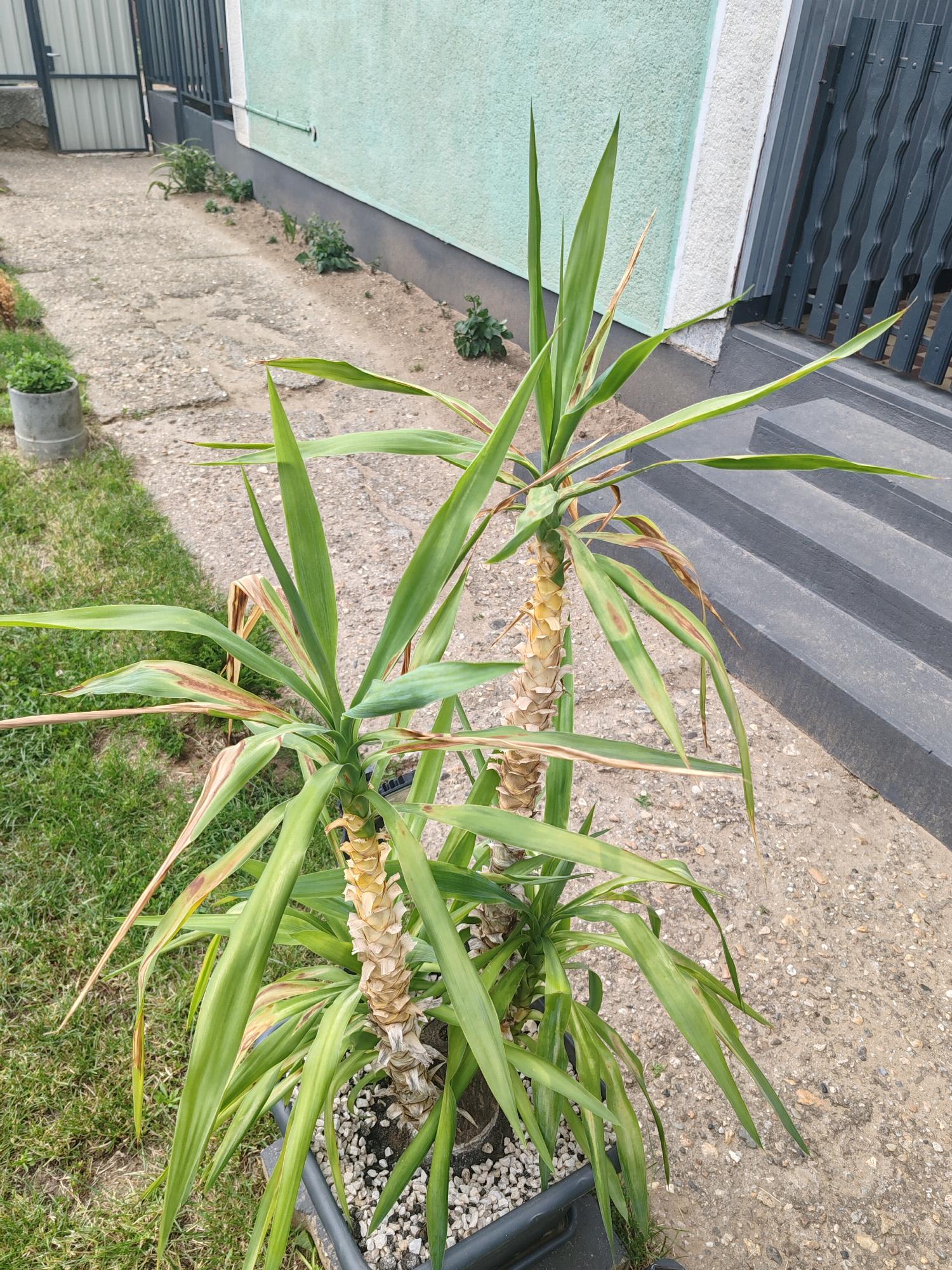 Kedves József. A jukkákat mikor vitte ki a szabadba? Hirtelen kerültek ki a lakásból a napfényre? Nagyon úgy tűnik, hogy napégés a tünet. Az edény is kicsi.