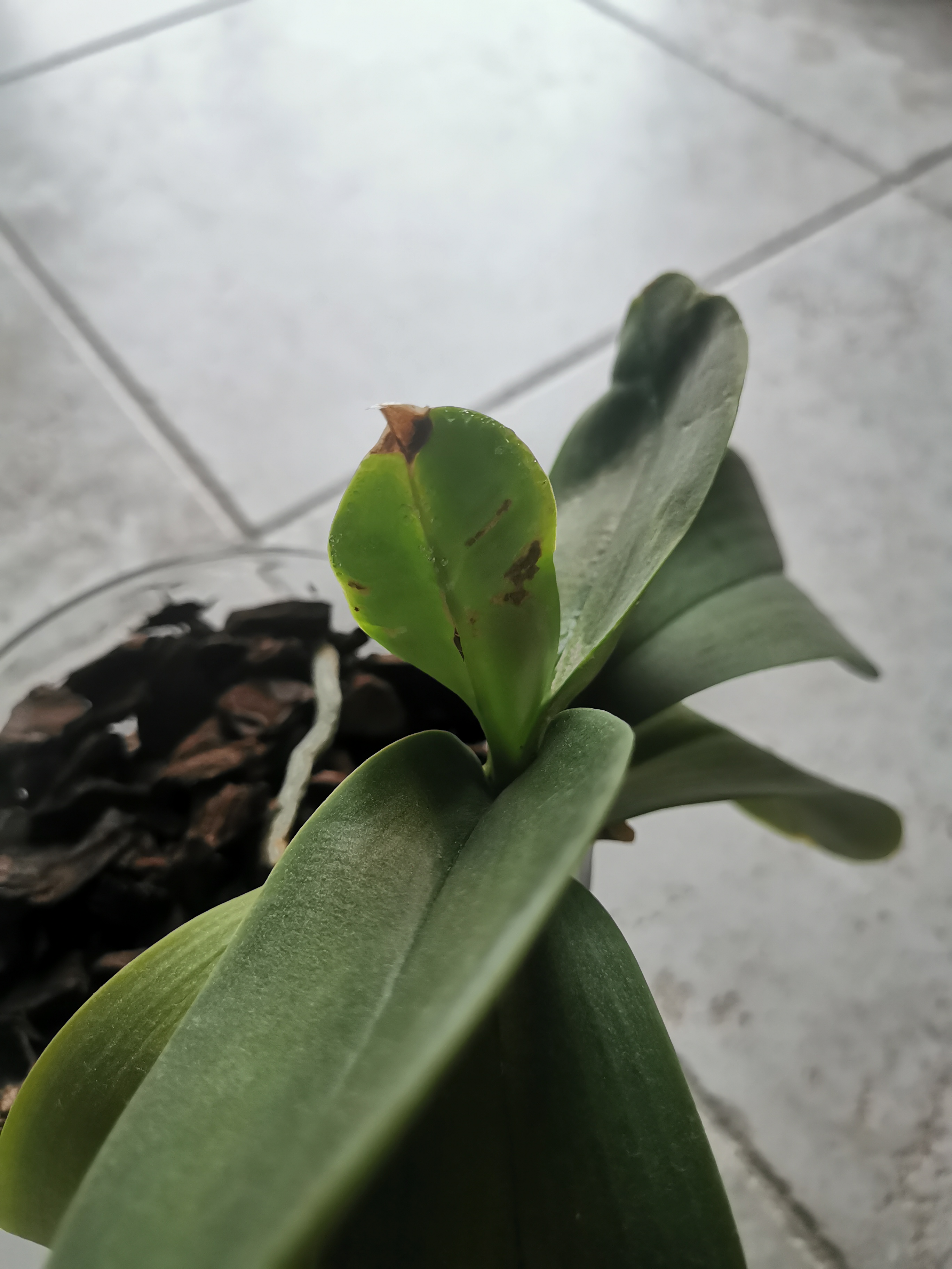 Gyengültség, napégés, esetleg baktériumos betegség jelei látszanak. Lehet, hogy ideje friss közegbe átültetni a növényt. Ültetés után ne adjon semmilyen tápot. Az ültetőközegbe azonban keverhet hatású balkonnövény tápot, vagy szúrhat egy Osmocote tablettát.
