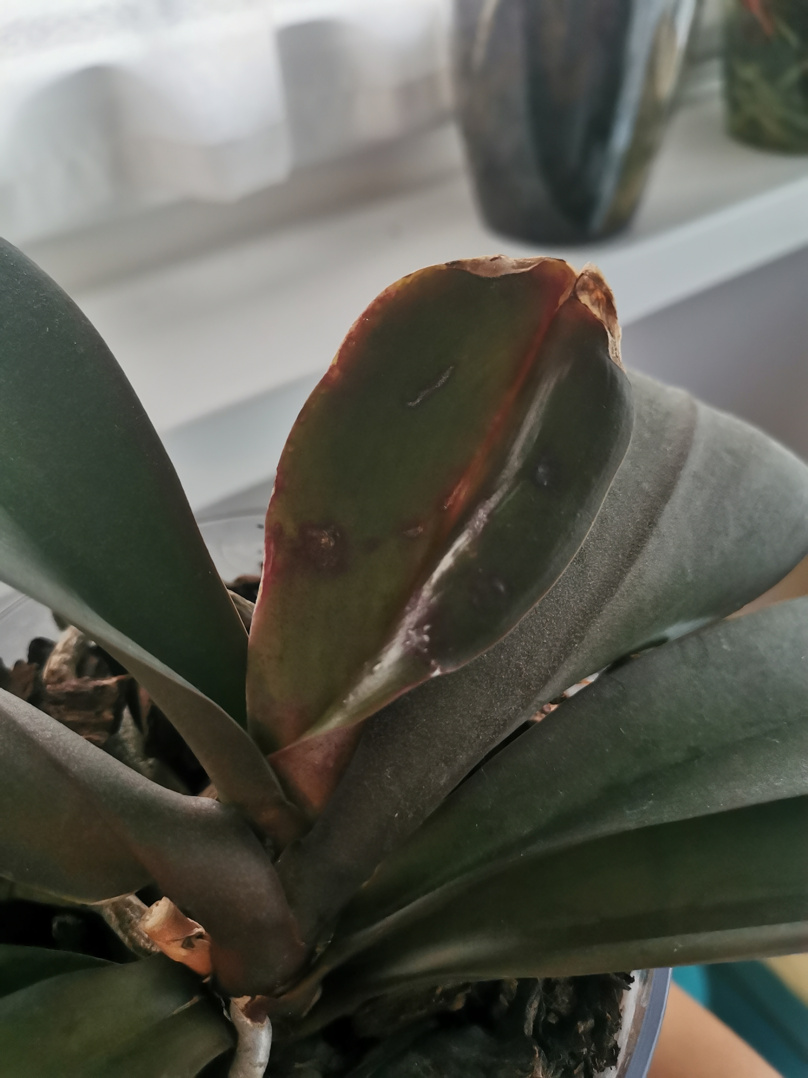 A fotóalapján akár fizikai sérülés is lehet! De állati kártevő is teheti (szúró-szívó szájszerv)! Írja le, hogy milyen körülmények között és hogyan ápolja a növényt. Esetleg van a lakásban háziállat? Kérek a fonákról is jól nagyítható nagy felbontású fényképet!