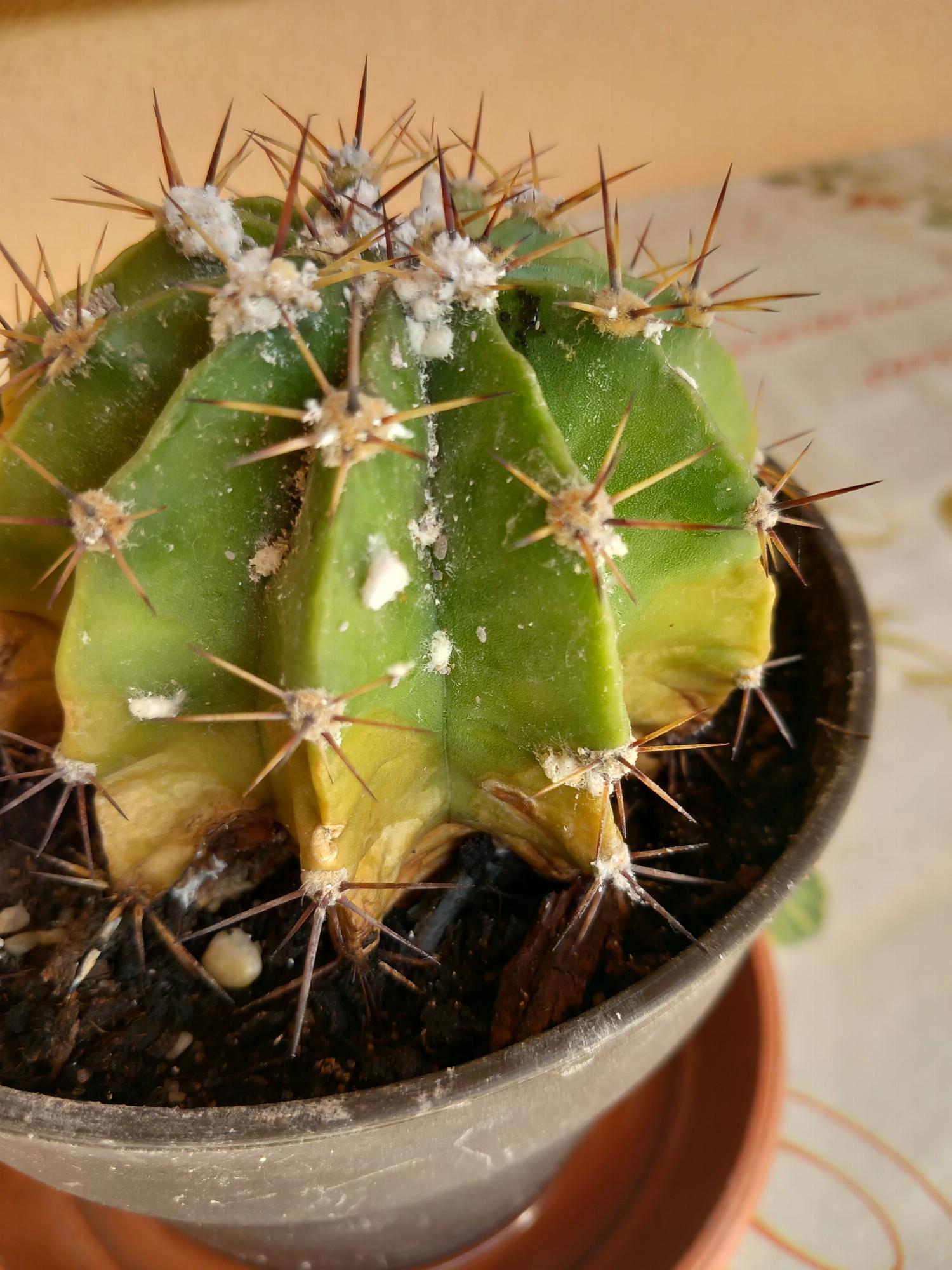 Kedves Csaba! Úgy tűnik, hogy a kaktusz sok vizet kap, ettől rothadhat a töve. A kaktusz testén gyapjas pajzstetű-telepek láthatók, a ragacsos váladék az ürülékük (mézhatmat). A kártvevő kedveli a nedvesebb, párásabb környezetet. A telepeket mechanikailag tudja eltávolítani: gyógyszertárban kapható 70%-os alkohololdatba mártott fültisztítóval óvarosan szedegesse le őket. Majd a növényt permetezze meg káliszappannal vagy NeemAzallal. Fontos, hogy különítse el a növényt a többitől, ültesse át friss kaktuszföldbe és ügyeljen az öntözére, és ne legyen fülledt a levegő, műtrágyázni sem szabad. Folyamatosan figyelje a növényt.