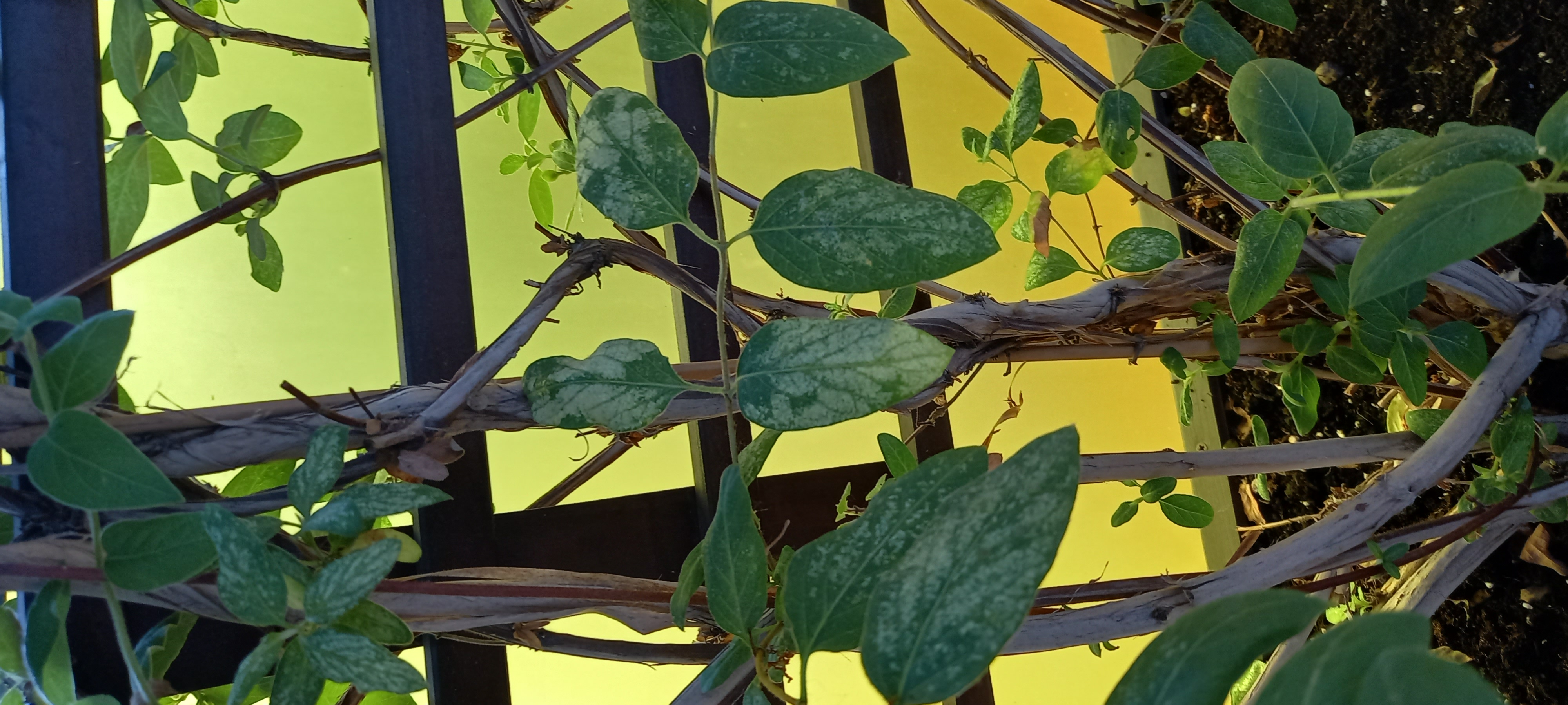 A tünetek lisztharmatra utalnak, aminek az elődleges oka a fülledt, párás környezet, rossz átszellőzés, túl sűrű állomány, illetve a mostani túl sok eső miatti párásság. Permetezzen kéntartalmú készítménnyel. Házi praktika a szódabikarbónás oldattal töténő permetezés: 1 evőkanál szódabikarbónát 1 liter langyos vízben feloldva kell a növényre permetezni. Metszéssel szellősebbé kellene tenni az állományt. Célszerű tápanyagot is adni a növénynek.