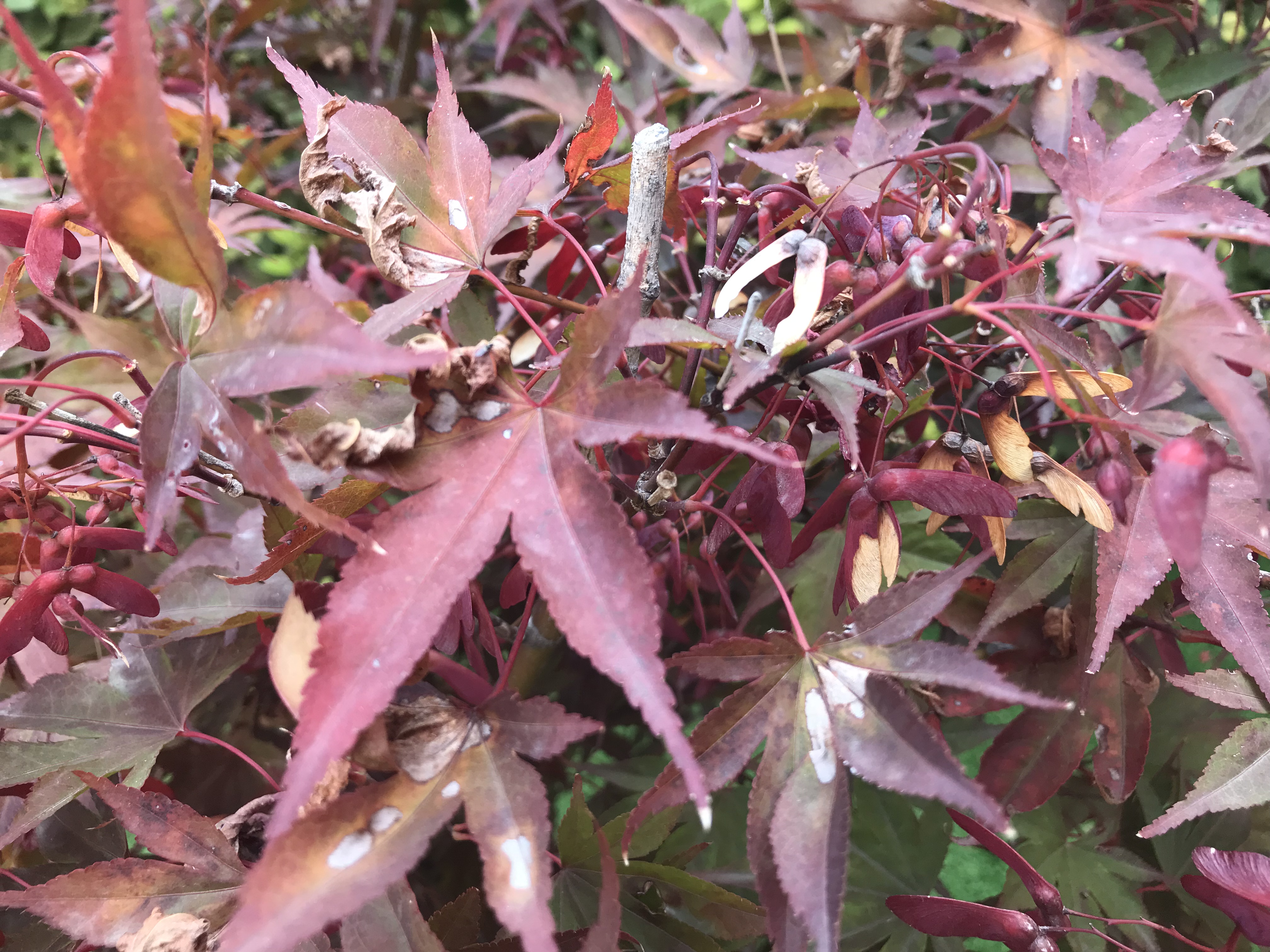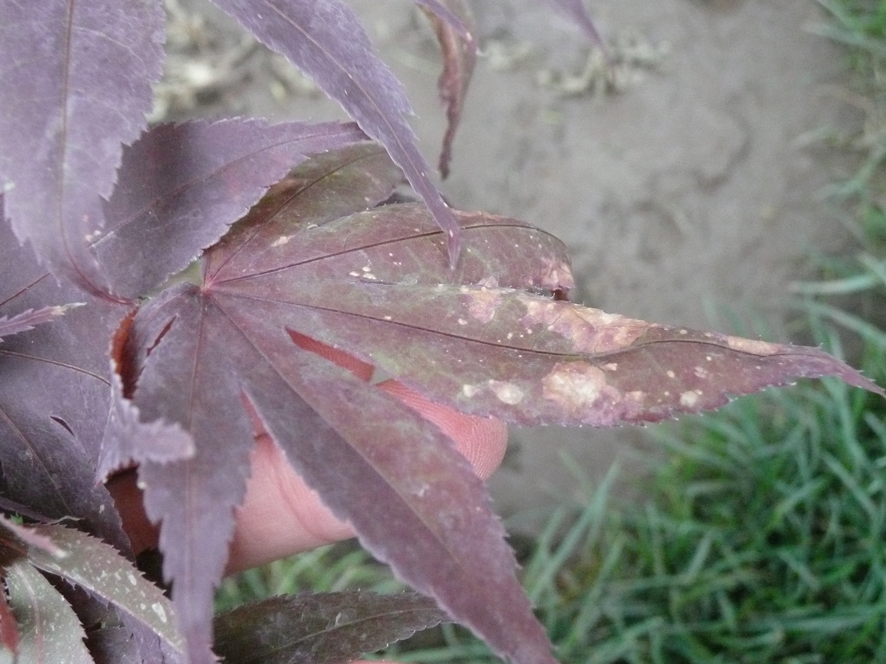 A japán juharfám levelén apró, sötét pöttyök jelentek meg. A pöttyök nőnek, a levelek száradnak és végül ledobja a fa.
