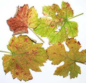 A tünetek nem károsítótól származnak, hanem tápanyag-probléma mutatkozik. Azt jó lenne tudni, mennyi ilyen levél van a tőkén: Ha csak néhány, nem érdemes vele foglalkozni, hiszen közel az ősz. Ha az egész tőke ilyen, érdemes valamilyen szerves anyagot bedolgozni a talajba, pl. marhatrágya zsákos, melynek a kijuttatása egyszerű és mindenféle tápanyagot tartalmaz.