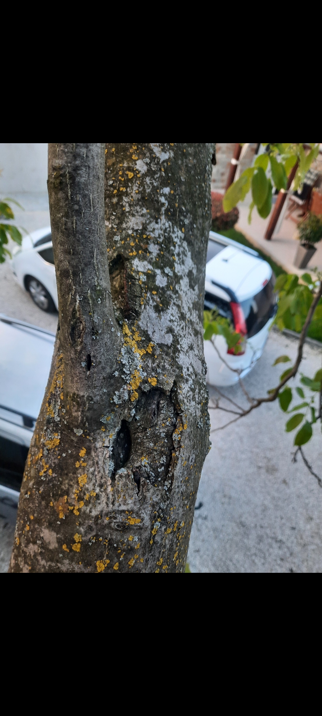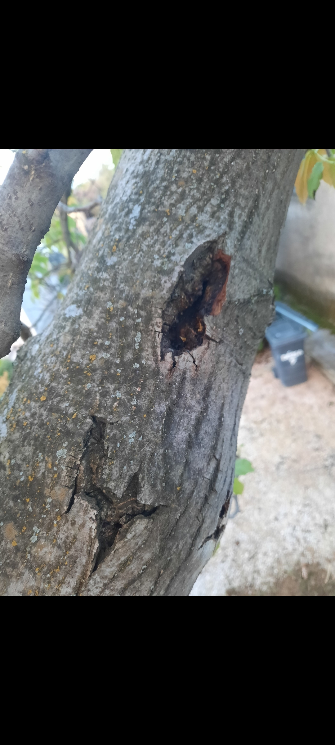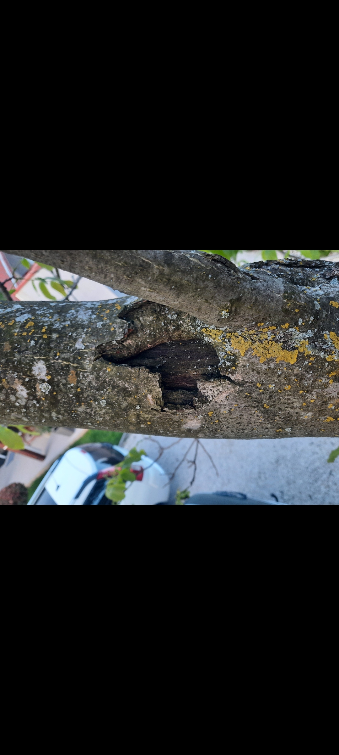 A törzsén nincsenek lyukak, csak egész sötétbarna, szinte fekete elszíneződés, amely a földtől indult 2-3 éve és terjed felfelé, szerintem körben is.