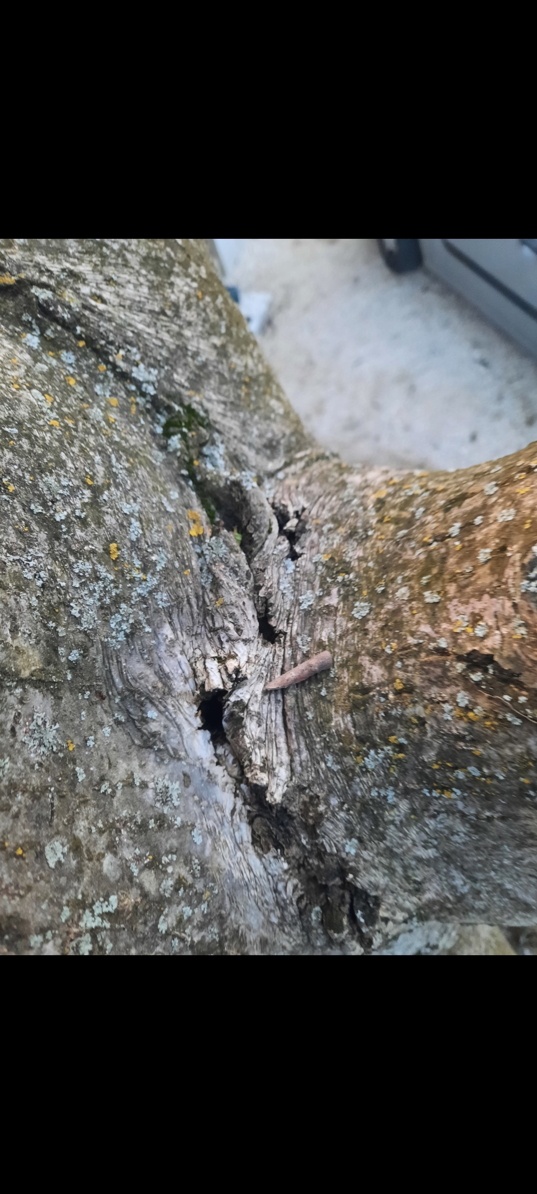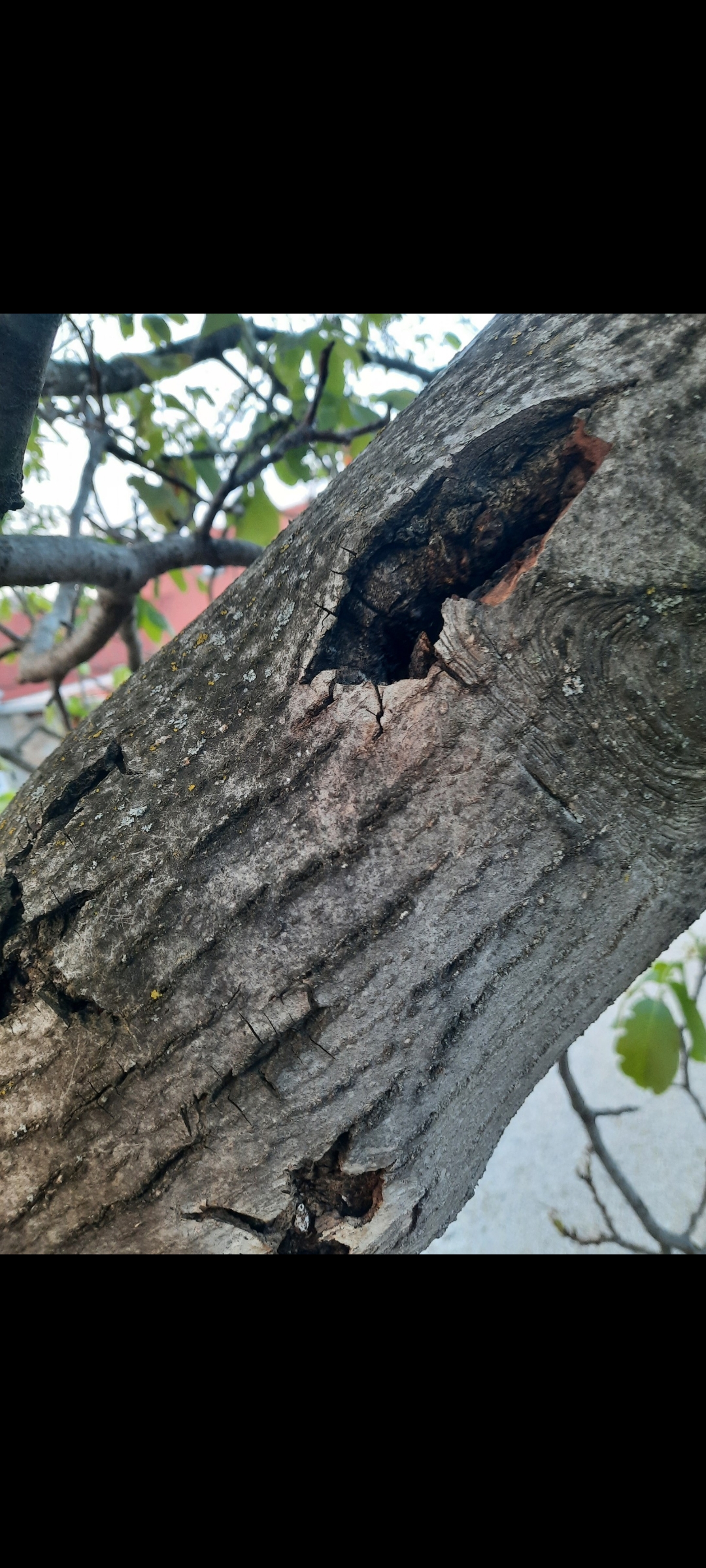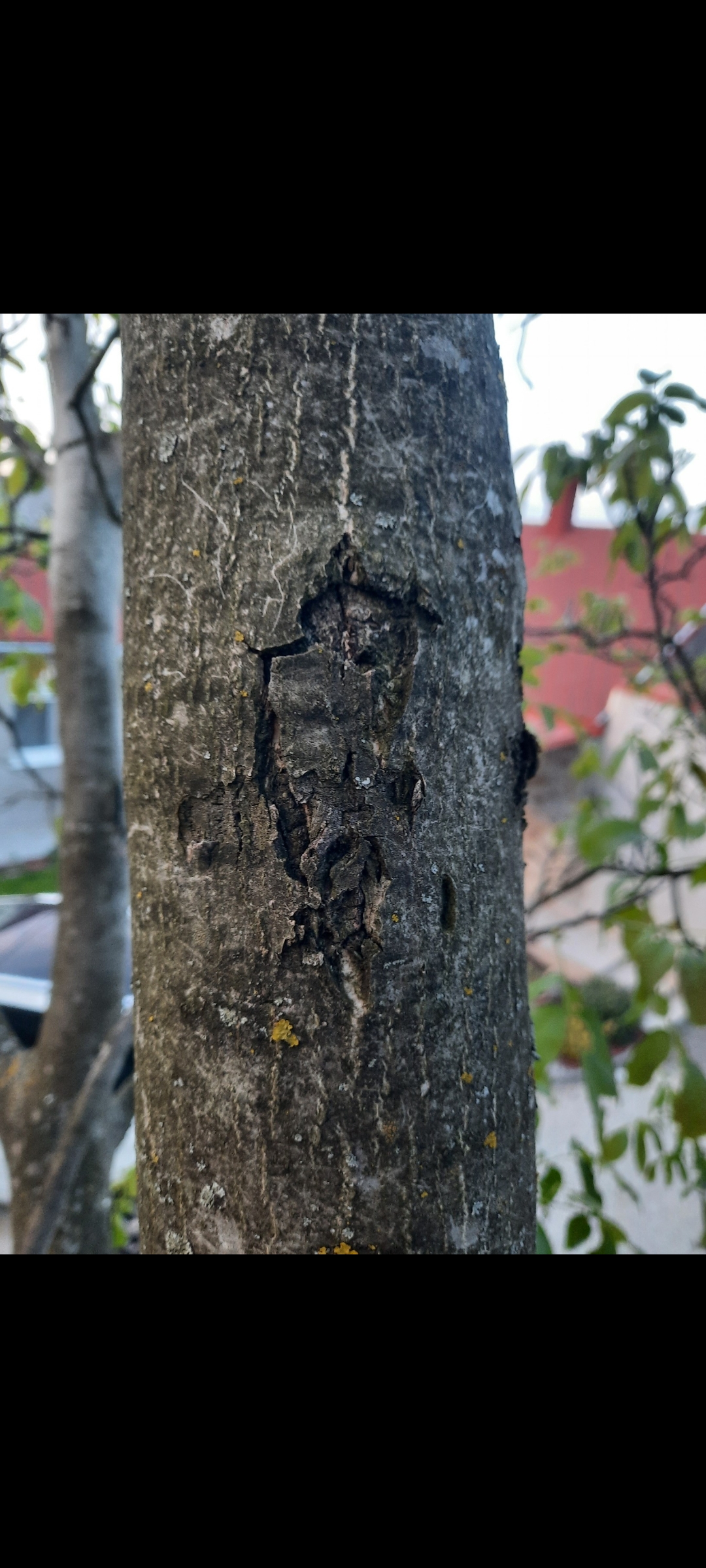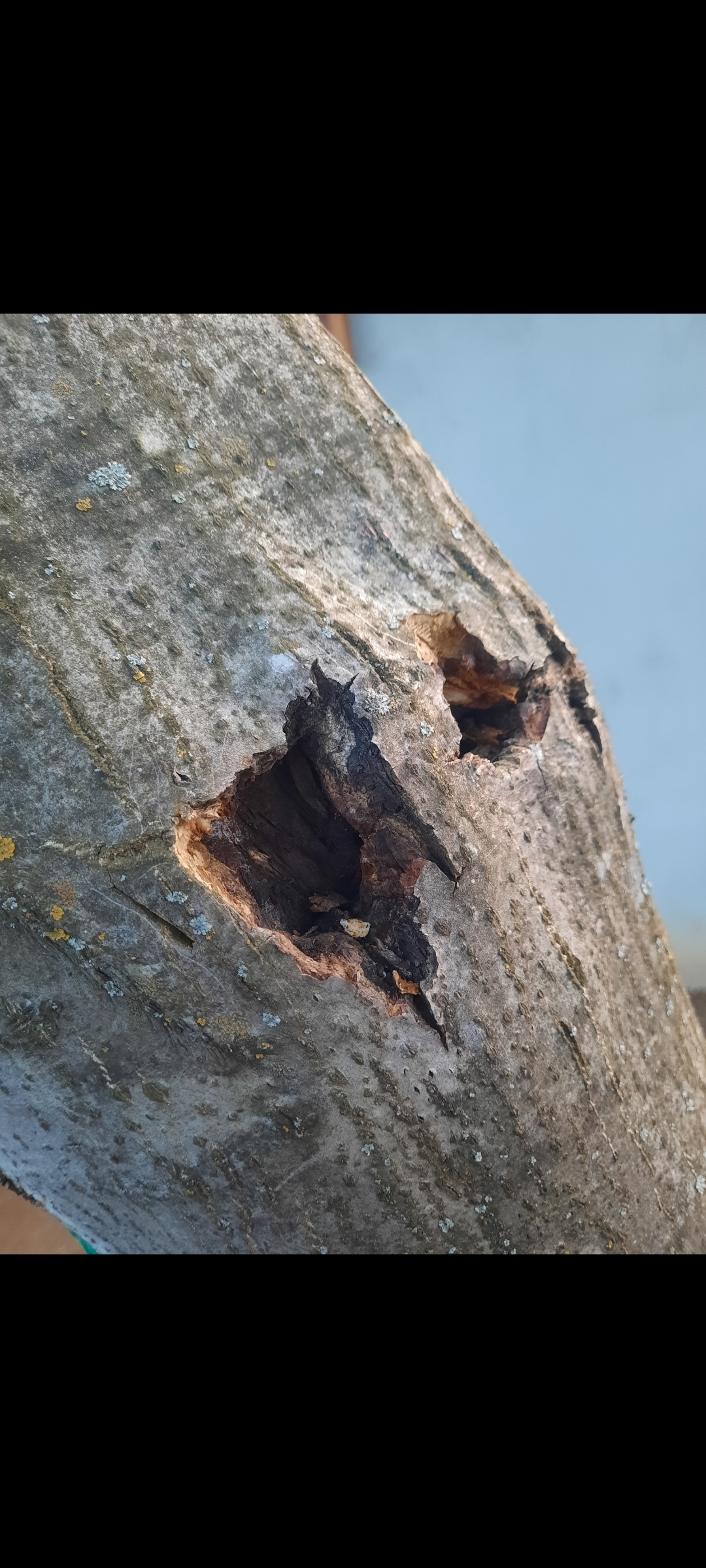 A törzsén nincsenek lyukak, csak egész sötétbarna, szinte fekete elszíneződés, amely a földtől indult 2-3 éve és terjed felfelé, szerintem körben is.