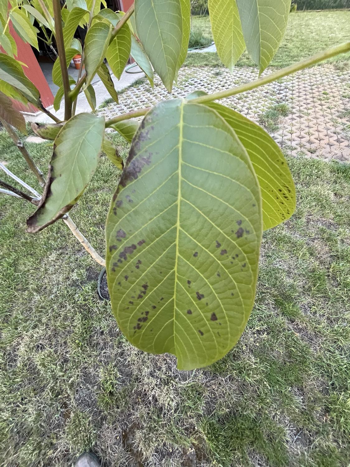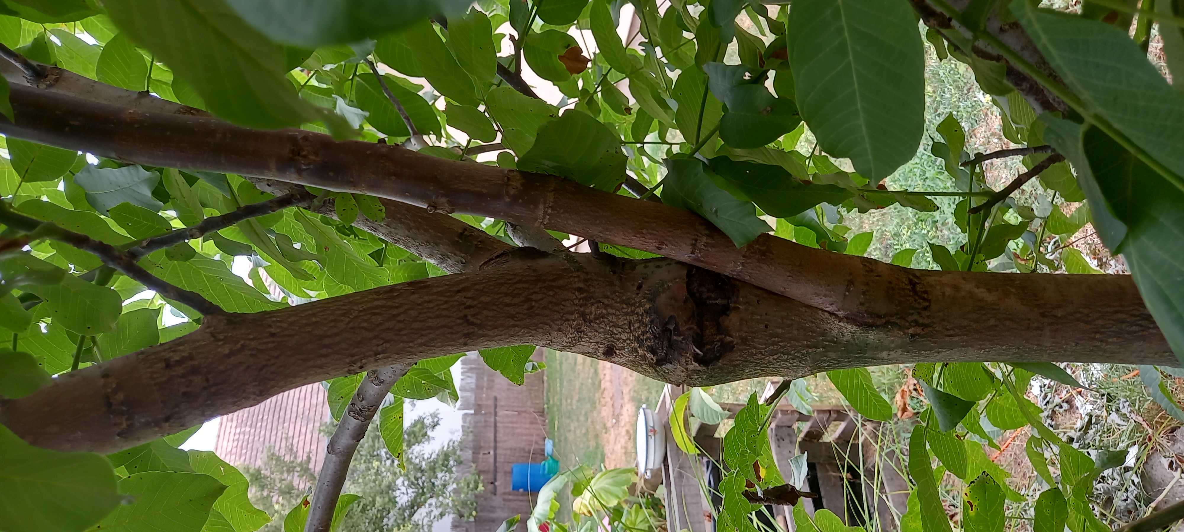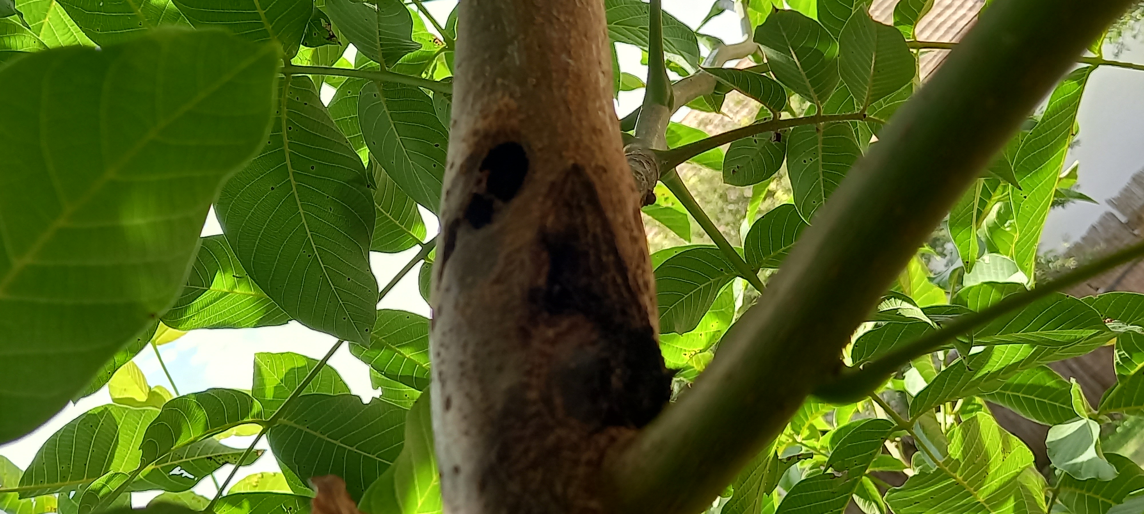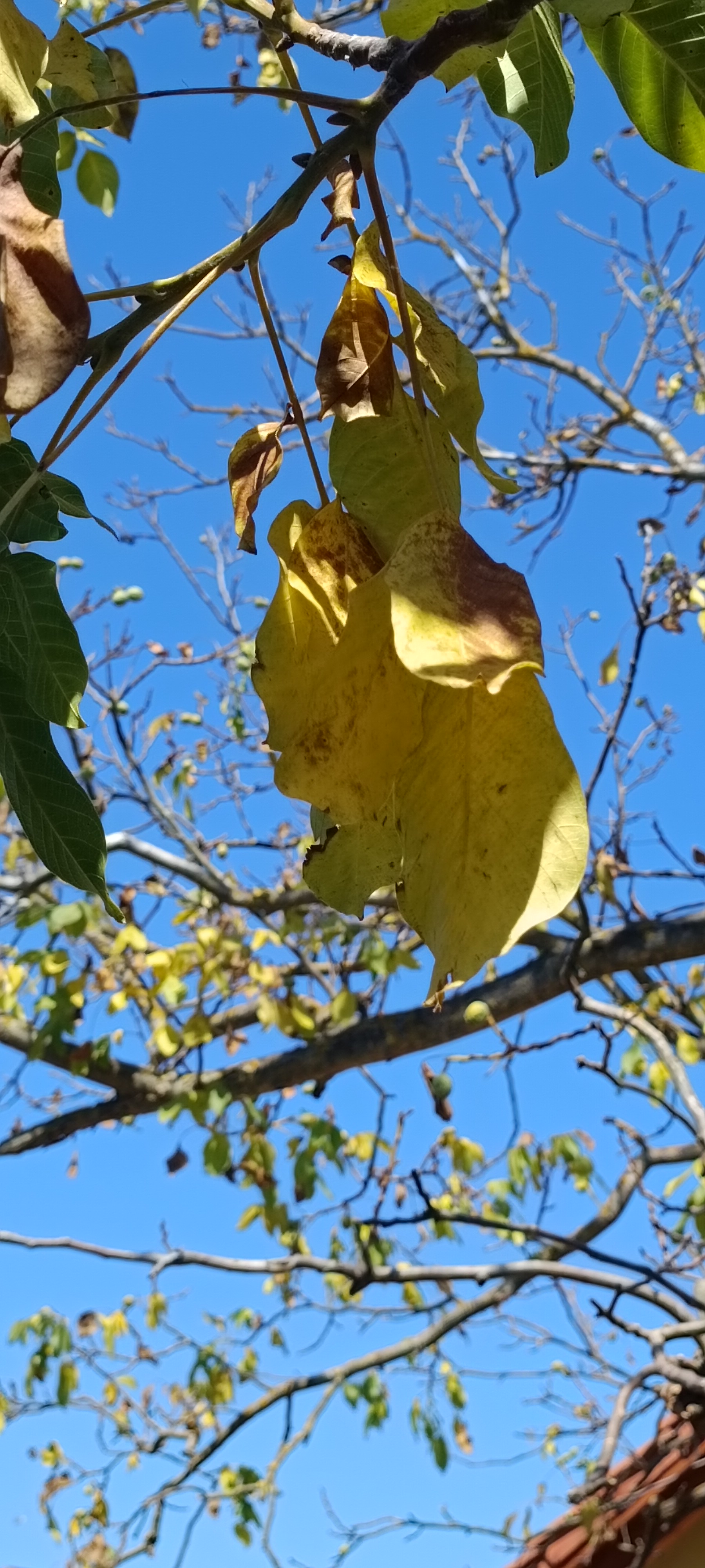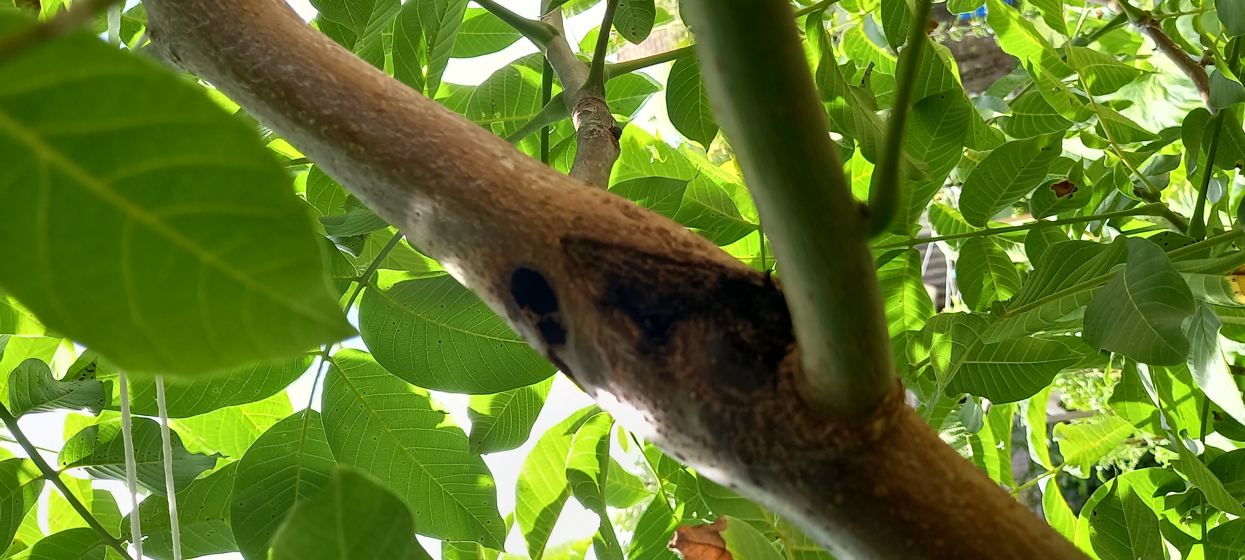 A társasházunk kertjében álló diófa egyes ágai teljesen vagy nagyrészt elhaltak, elhaltak. A rügyezés mintha még megtörtént volna. Ahol nő levél és termés egy ilyen száraz ág végén, az jelenleg kókadt, sárgás, barna foltokkal. Az ágon is látható sárgászöld folt.