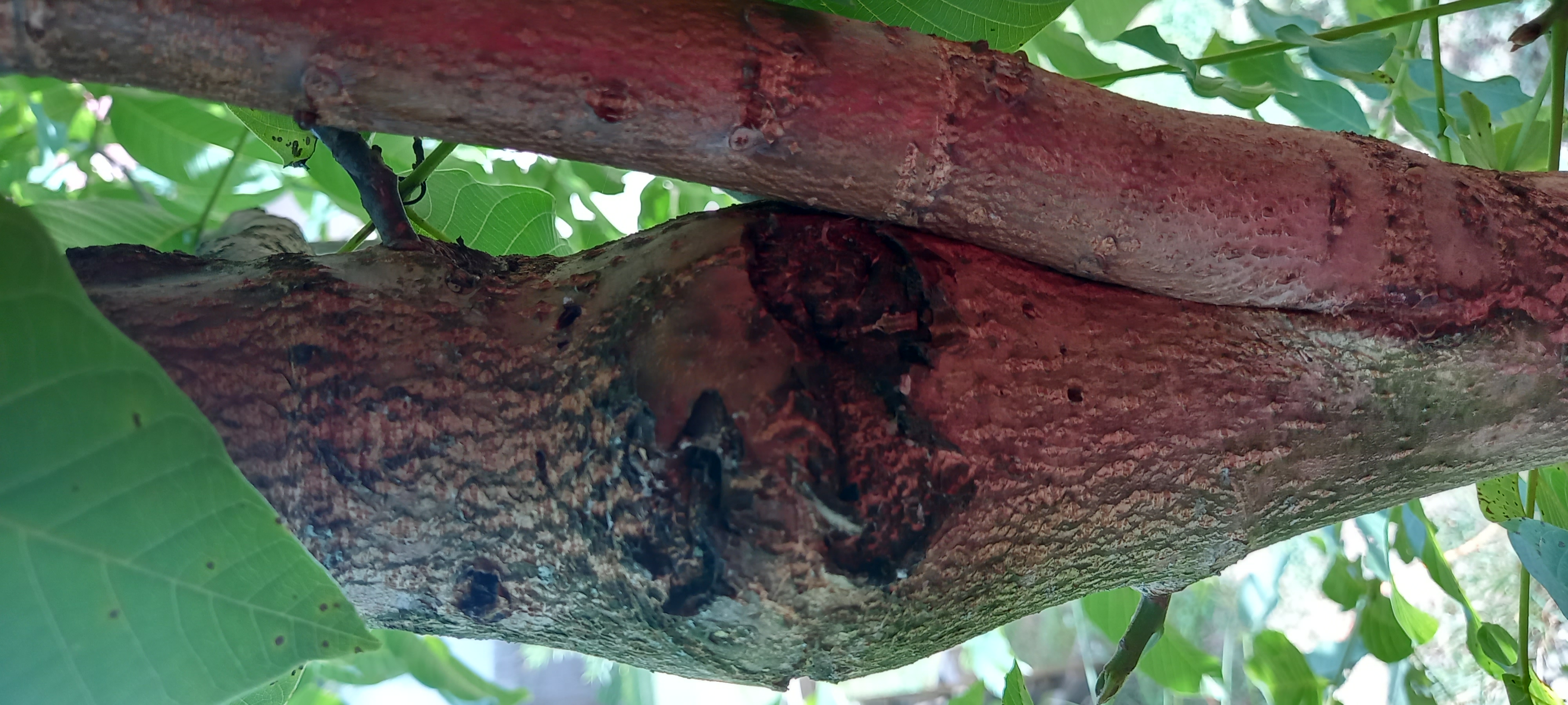 A képen azt látom, hogy a folt környezetéből új hajtás fejlődött ki, mely erősnek látszik. Nem tudom, hogy azon kifejlődtek-e levelek, vagyis él-e a hajtás. A folt lehet baktérium fertőzéstől - de annyira élesen válik el az elszíneződött rész, hogy még ez sem biztos. A kórokozók fertőzése nyomán látható egy továbbhaladási szándék. Ajánlatom: az elszíneződött részt vastagon kenje be Bordói lével. Amikor a kezelés repedezni kezd, a munkát ismételje meg.