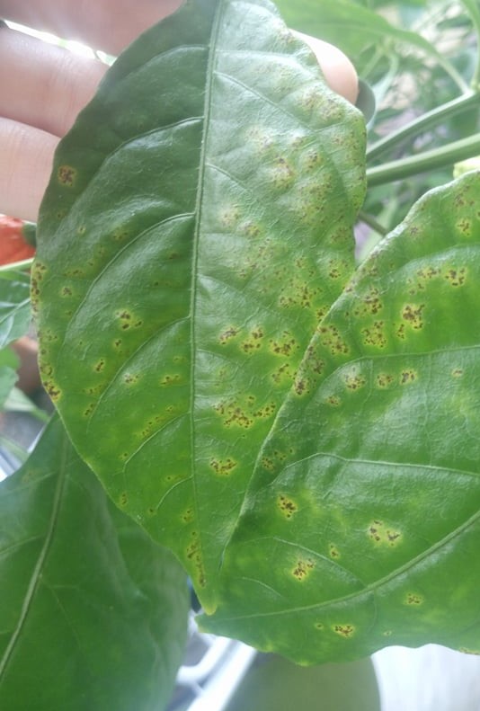 Szeretnék tanácsot kérni az alábbi betegség kapcsán. Chili paprikán jött elő az alábbi foltosodás. A levelek kissé elsárgulnak, majd lehullanak. Gazdaboltban atkára gyanakodtak, 2-szer bepermeteztem őket Ortus permetszerrel, azonban tovább terjedt. (Panelban nevelem a paprika növényeket, erkély nincs.) Megmenthetőek még a paprikák?