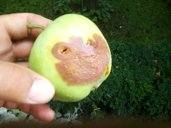 A kép alapján nagyon valószínű, hogy az almamoly károsítása nyomán kezdett el rothadni a gyümölcs. A lárva, amikor elhagyja a termést, lyukat hagy maga után, és ezen sérülés nyomán gombás betegség (monília) telepedhet meg. Az almamoly kártételét gyakorlatilag egyértelműsíti, ha a képen láthatóhoz hasonló terméseket kettévágva a magházig haladó járatot talál a gyümölcshúsban.